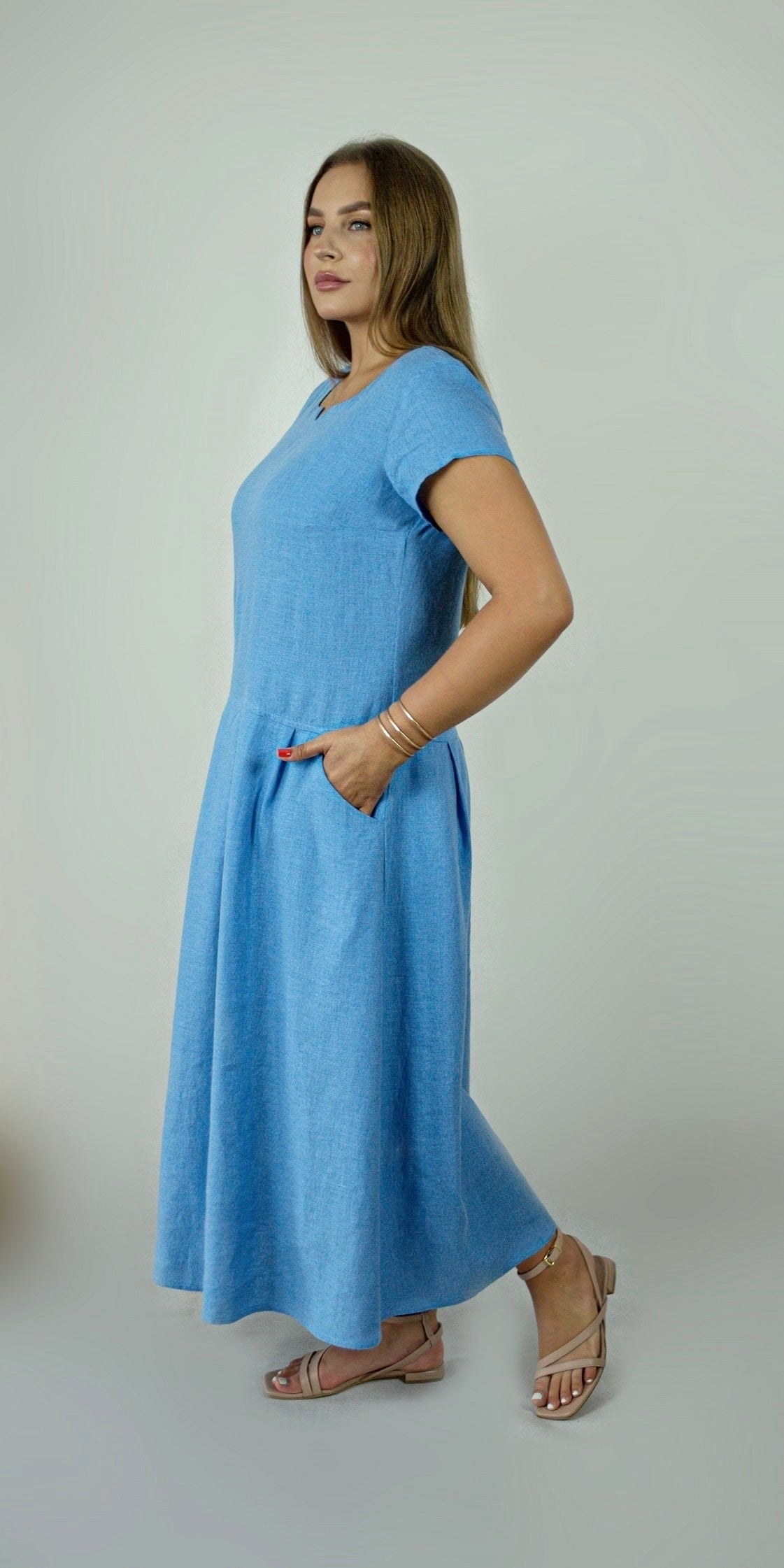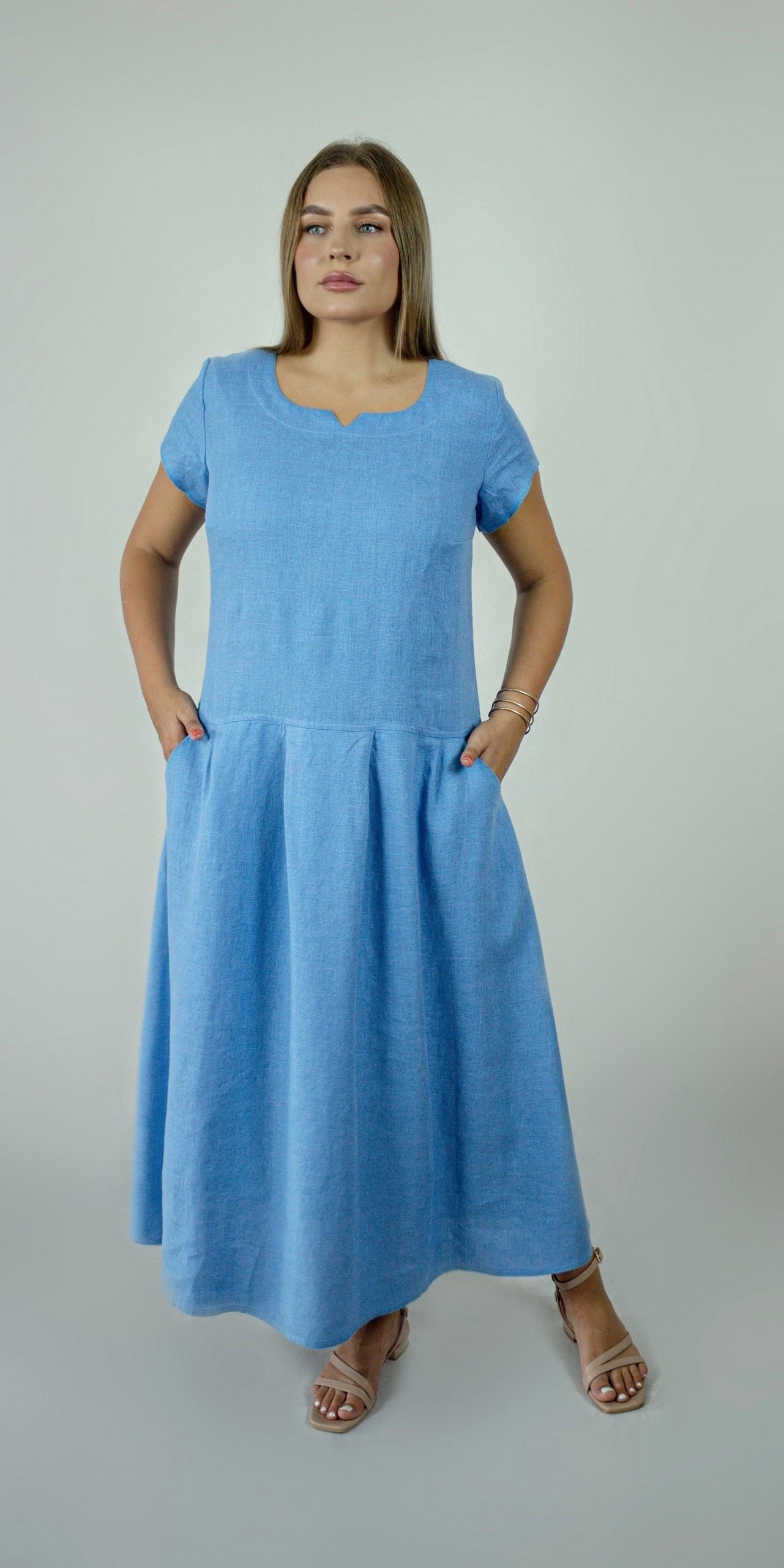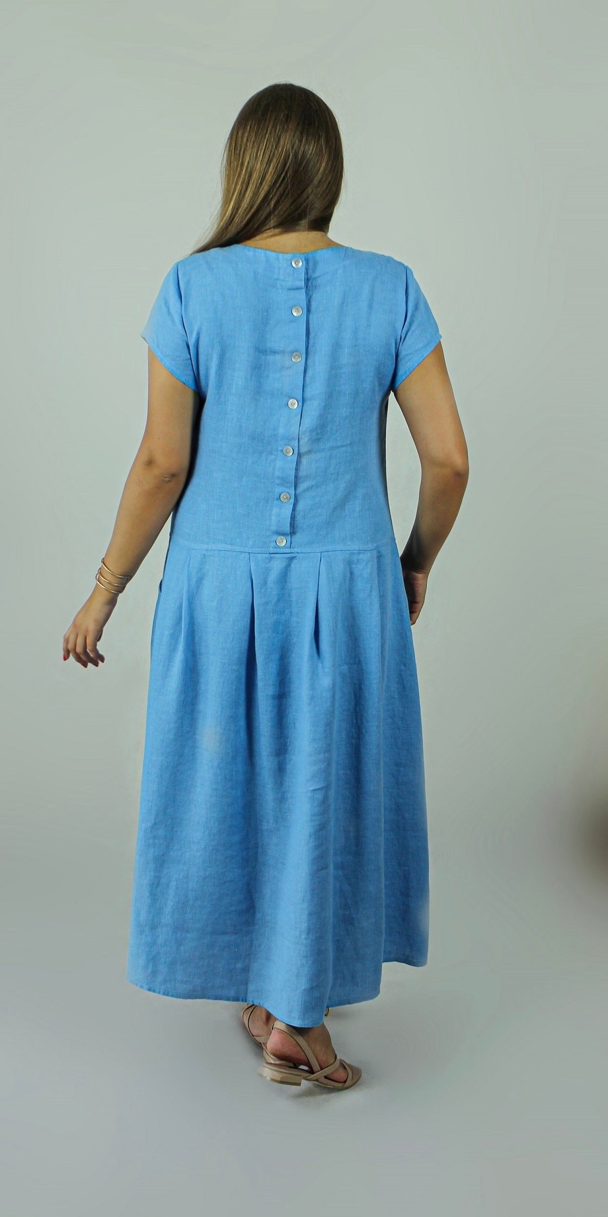 Blue linen dress pleated at the waist. Two side pockets. Round neck. Short sleeves. Imitation buttons on the back.