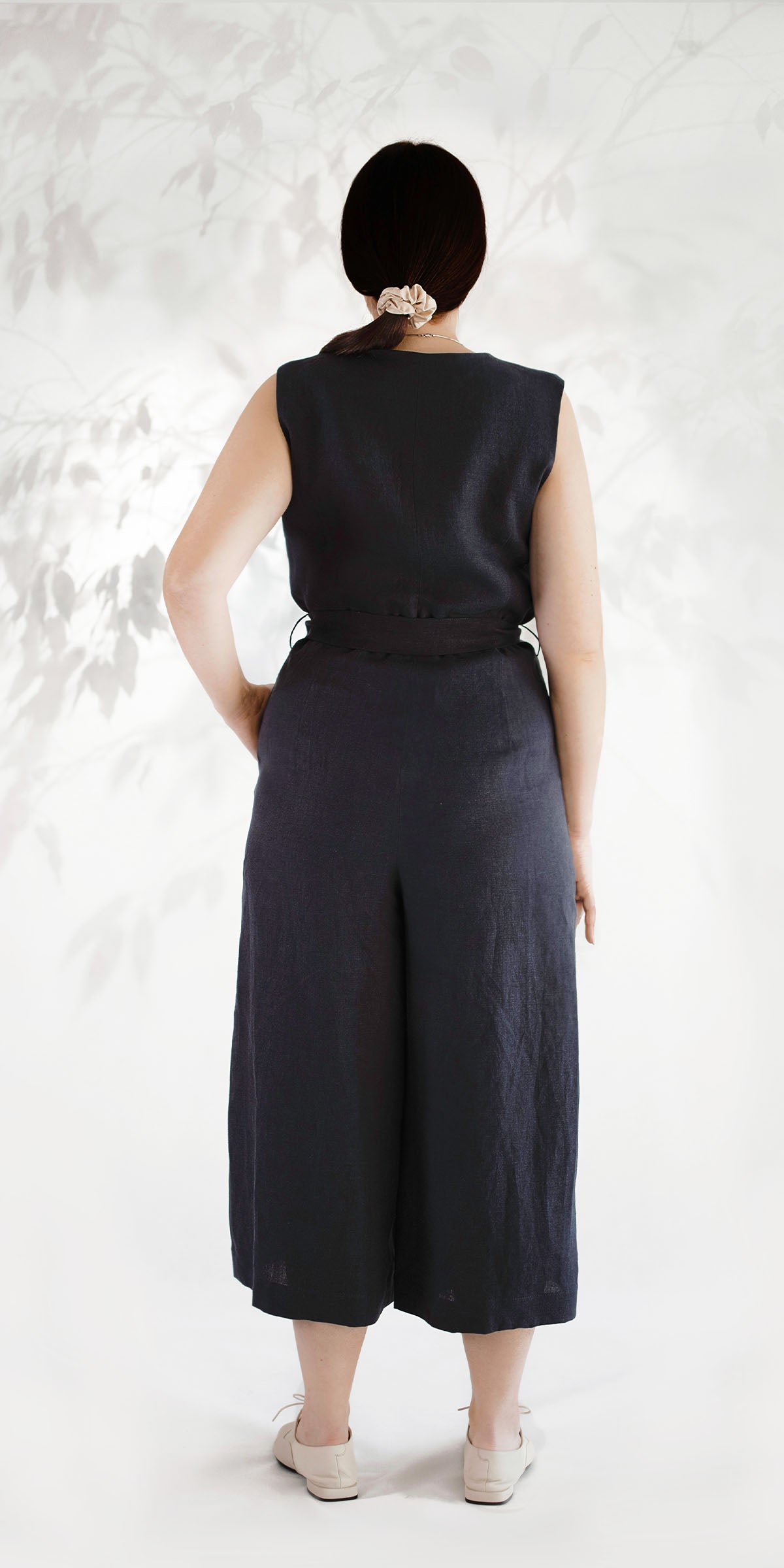 Lengvai prigludusio silueto plačiaklešnis kombinezonas, susegamas sagomis bei surišamas varstomu dirželiu. V formos kaklas. Dvi šoninės kišenės.