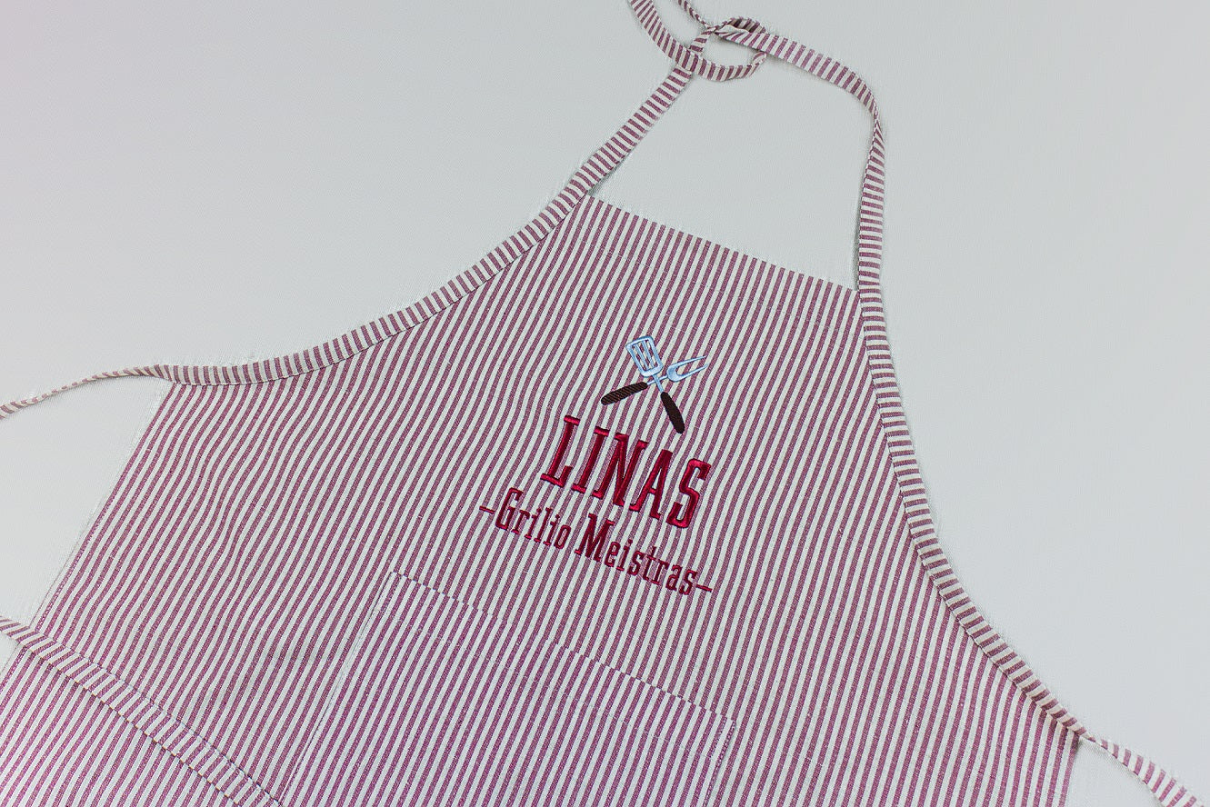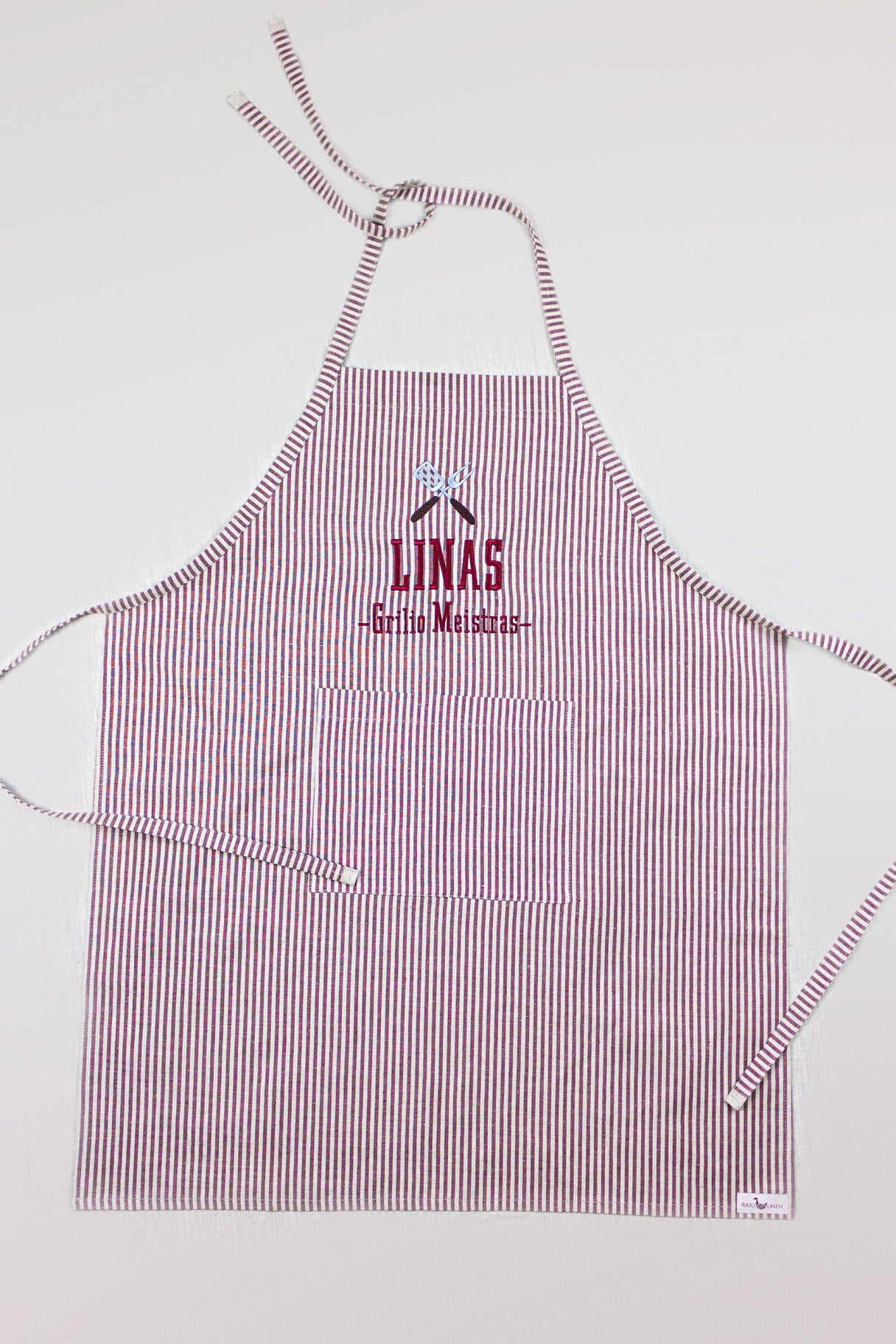 Lininė prijuostė su reguliuojamais raišteliais ties kaklu ir juosmeniu. Didelė kišenė priekyje. Galimi 6 spalvų variantai, bei jūsų pasirinktas užrašas.