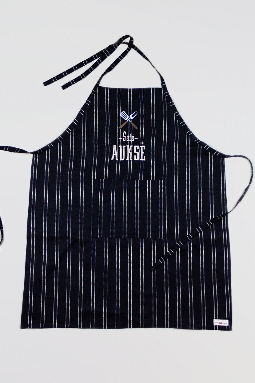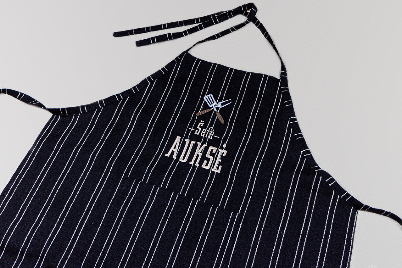 Lininė prijuostė su reguliuojamais raišteliais ties kaklu ir juosmeniu. Didelė kišenė priekyje. Galimi 6 spalvų variantai, bei jūsų pasirinktas užrašas.