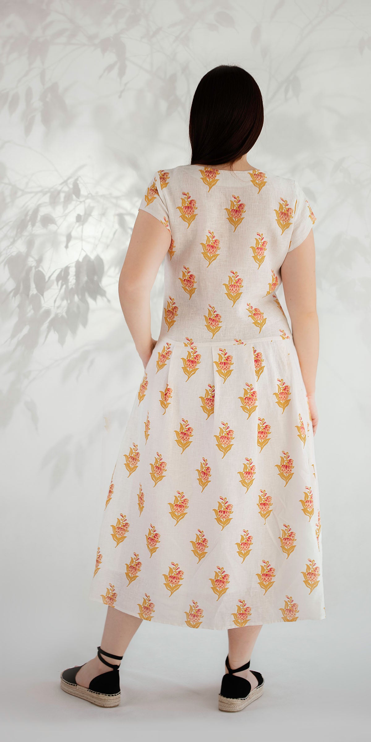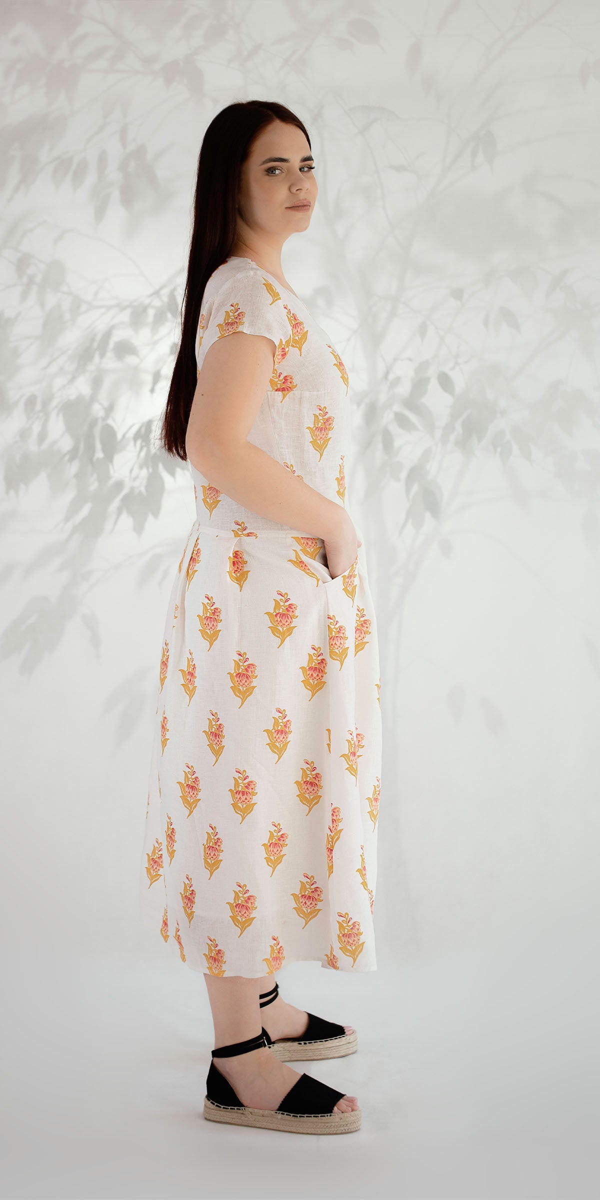 Ties juosmeniu klostuota plono lino suknelė trumpomis rankovemis. Dvi šoninės kišenės. Apvalus kaklas. Apatinė suknelės dalis nuo liemens yra su pamušalu.