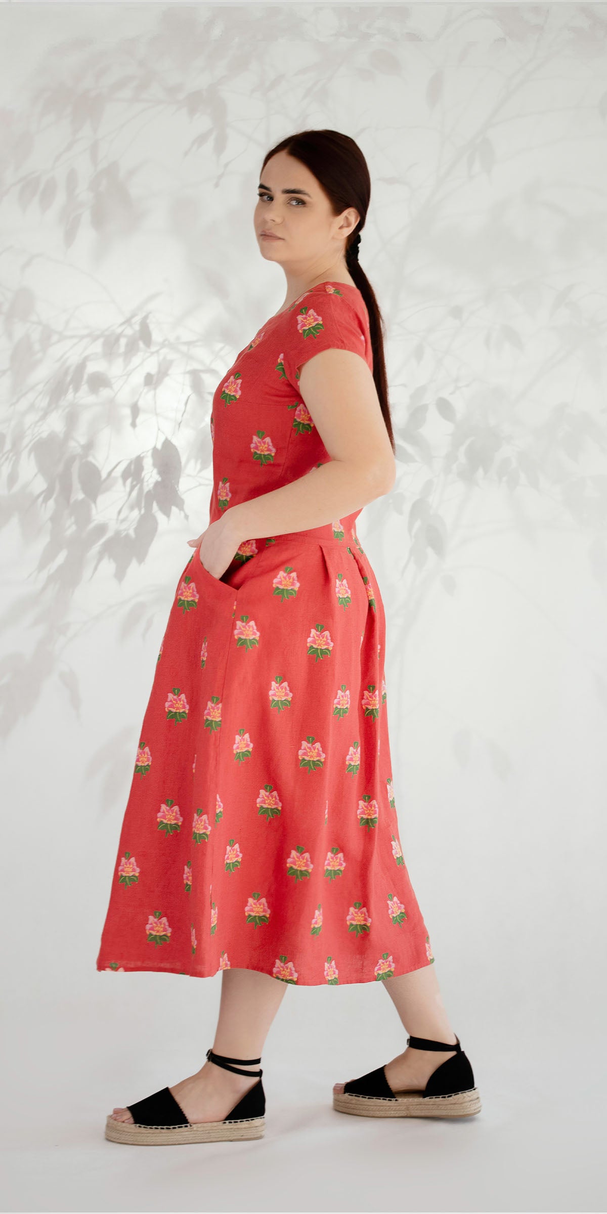 Ties juosmeniu klostuota plono lino suknelė trumpomis rankovėmis. Dvi šoninės kišenės. Apvalus kaklas. Apatinė suknelės dalis nuo liemens su pamušalu.