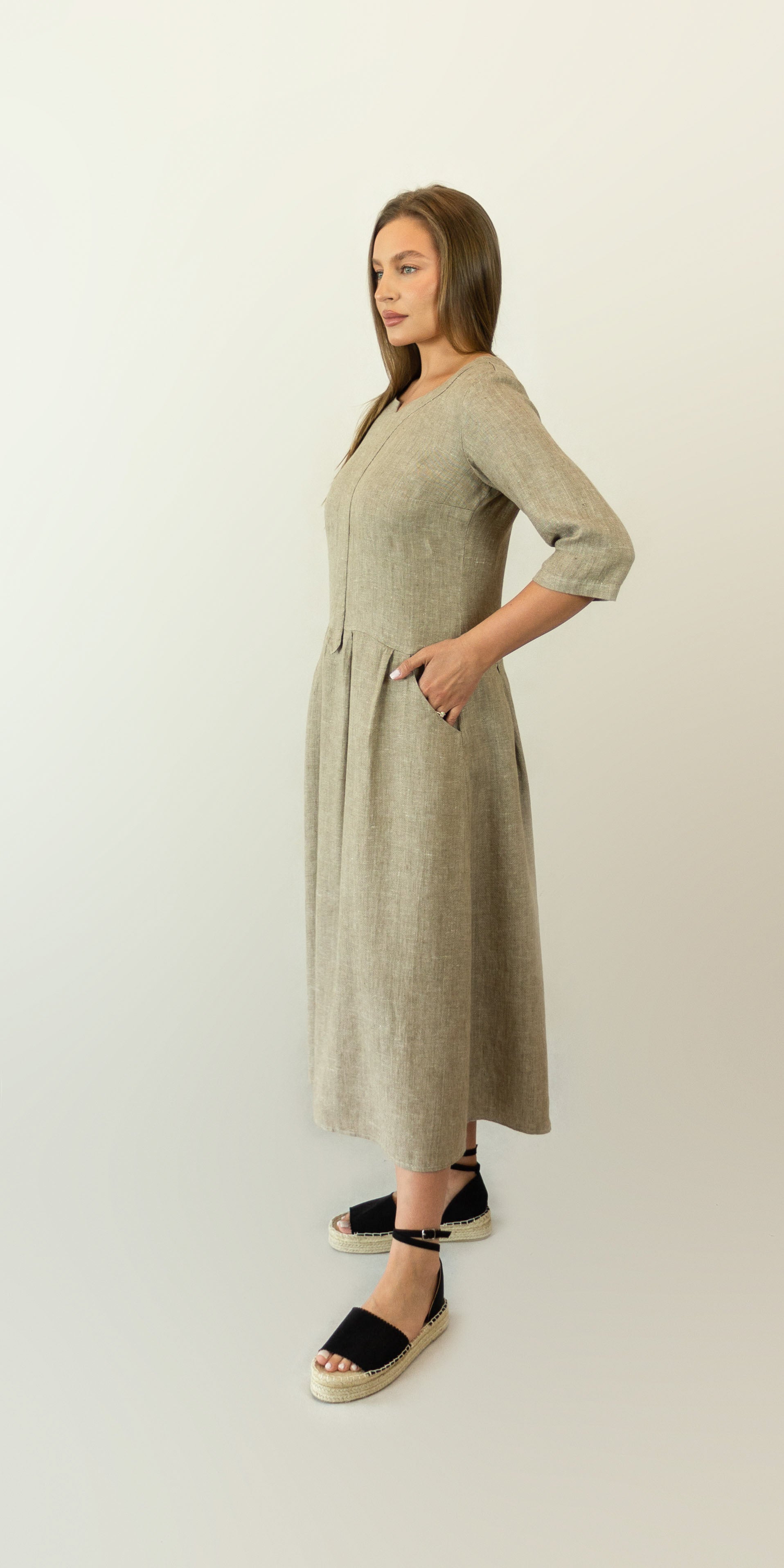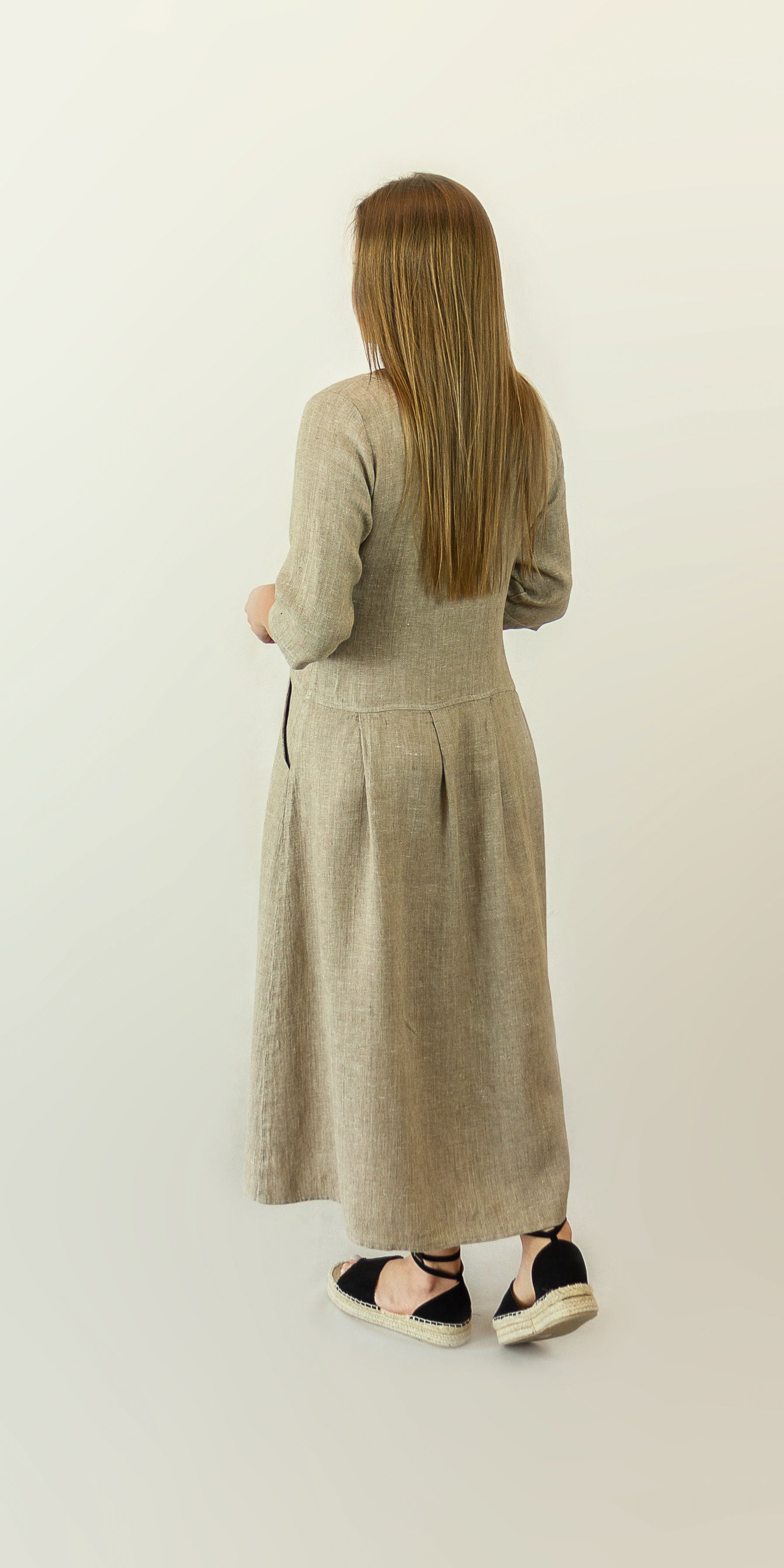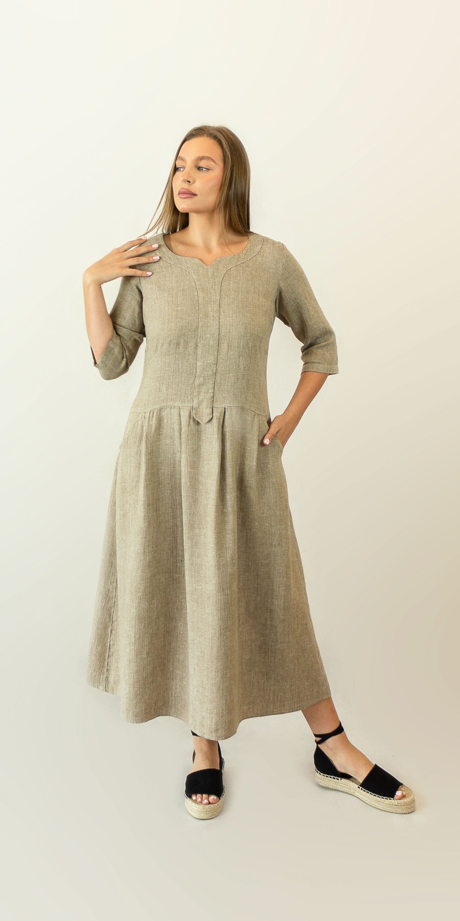 Ties juosmeniu klostuota, lengvai krentanti minkšto lino suknelė. Dvi šoninės kišenės. Apvalus kaklas ir dekoratyvinė detalė priekyje. Rankovių ilgis 3/4.