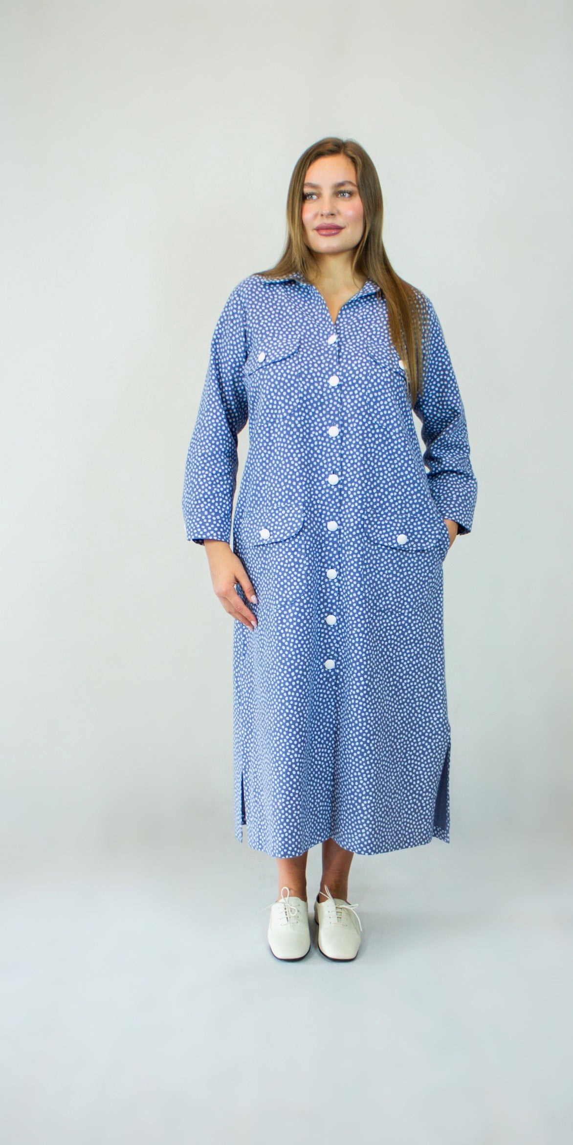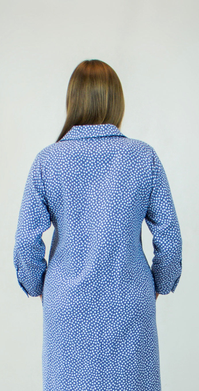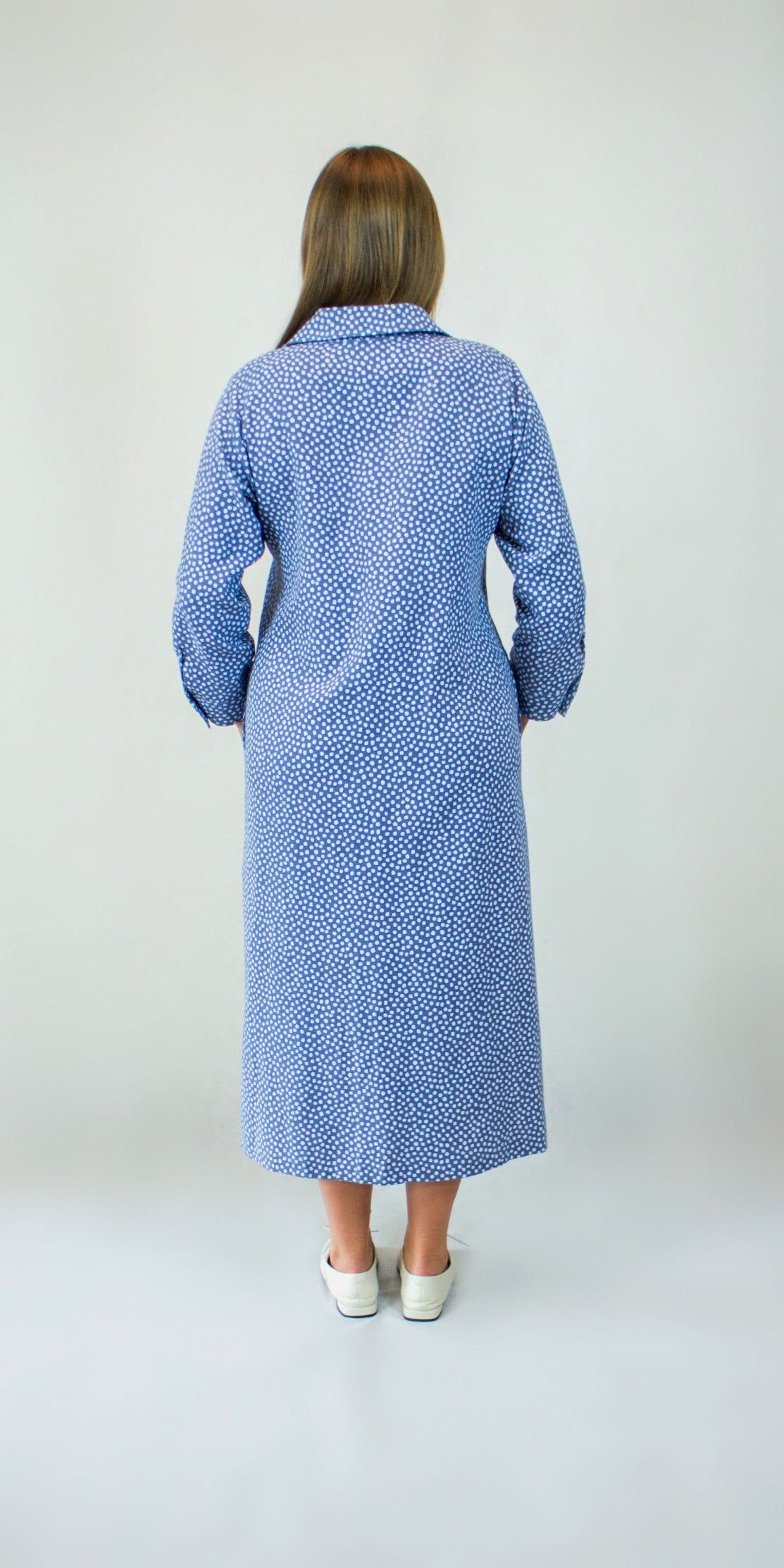 Taškuota storesnio lininio audinio marškinių tipo suknelė. Suknelė susegama to paties audinio aptrauktomis sagomis. Keturios uždėtinės kišenės priekyje ir dvi įleistinės kišenės šoninėse siūlėse. Užsegami rankogaliai, rankovių ilgis 4/5.