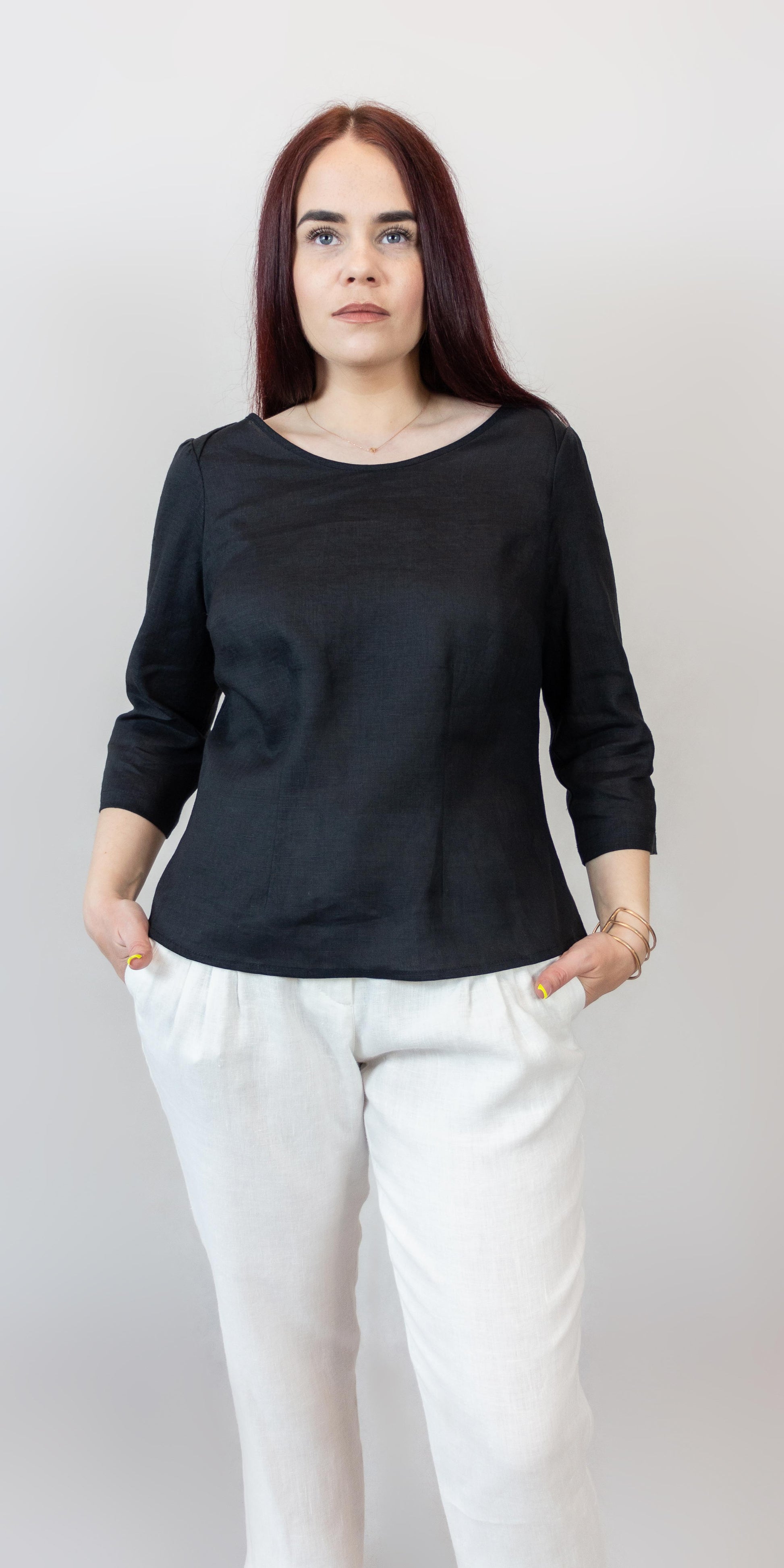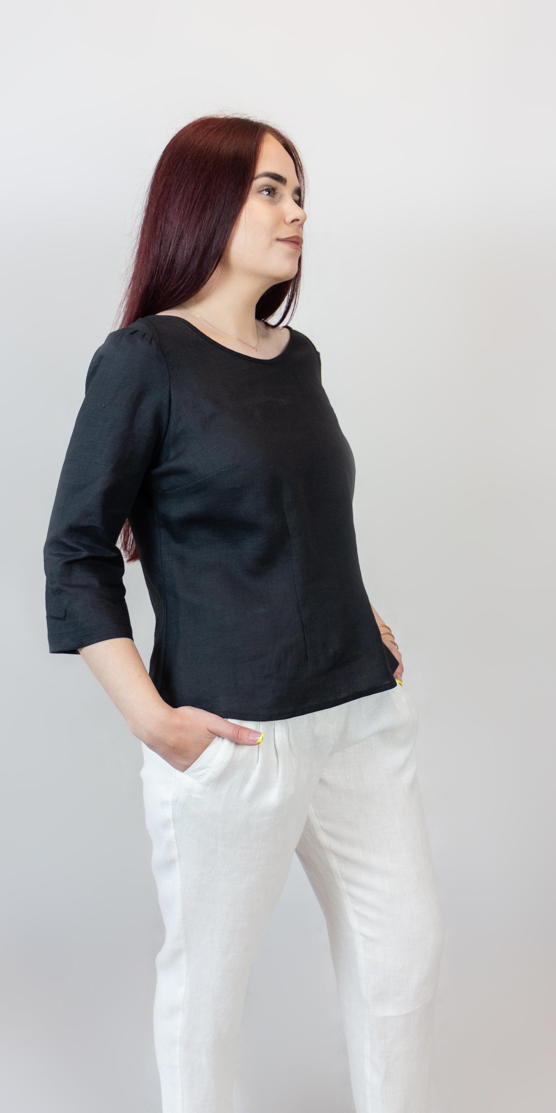 Lininė pusiau prigludusio silueto palaidinė. Rankovių ilgis 3/4, plonesnio audinio.