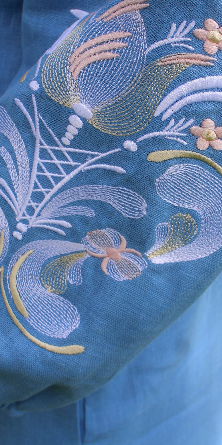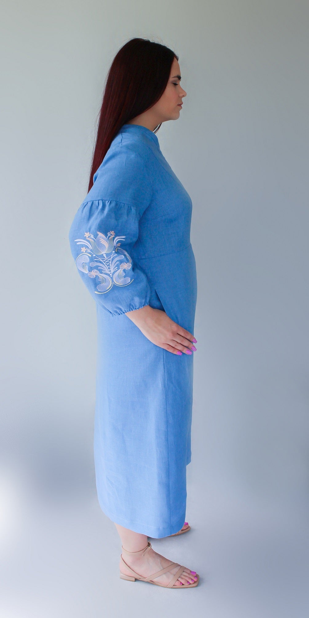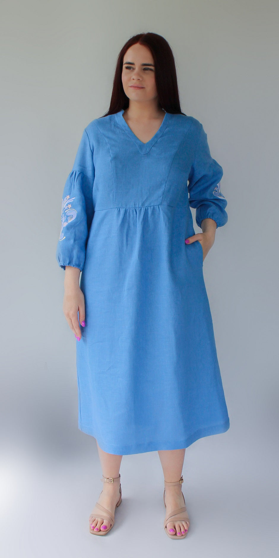 Ties juosmeniu raukta lininė suknelė. Dvi šoninės kišenės ties siūlėmis. V formos kaklas. Išskirtinumo suknelei suteikia 4/5 ilgio siuvinėtos rankovės. Apatinė suknelės dalis nuo liemens yra su pamušalu.