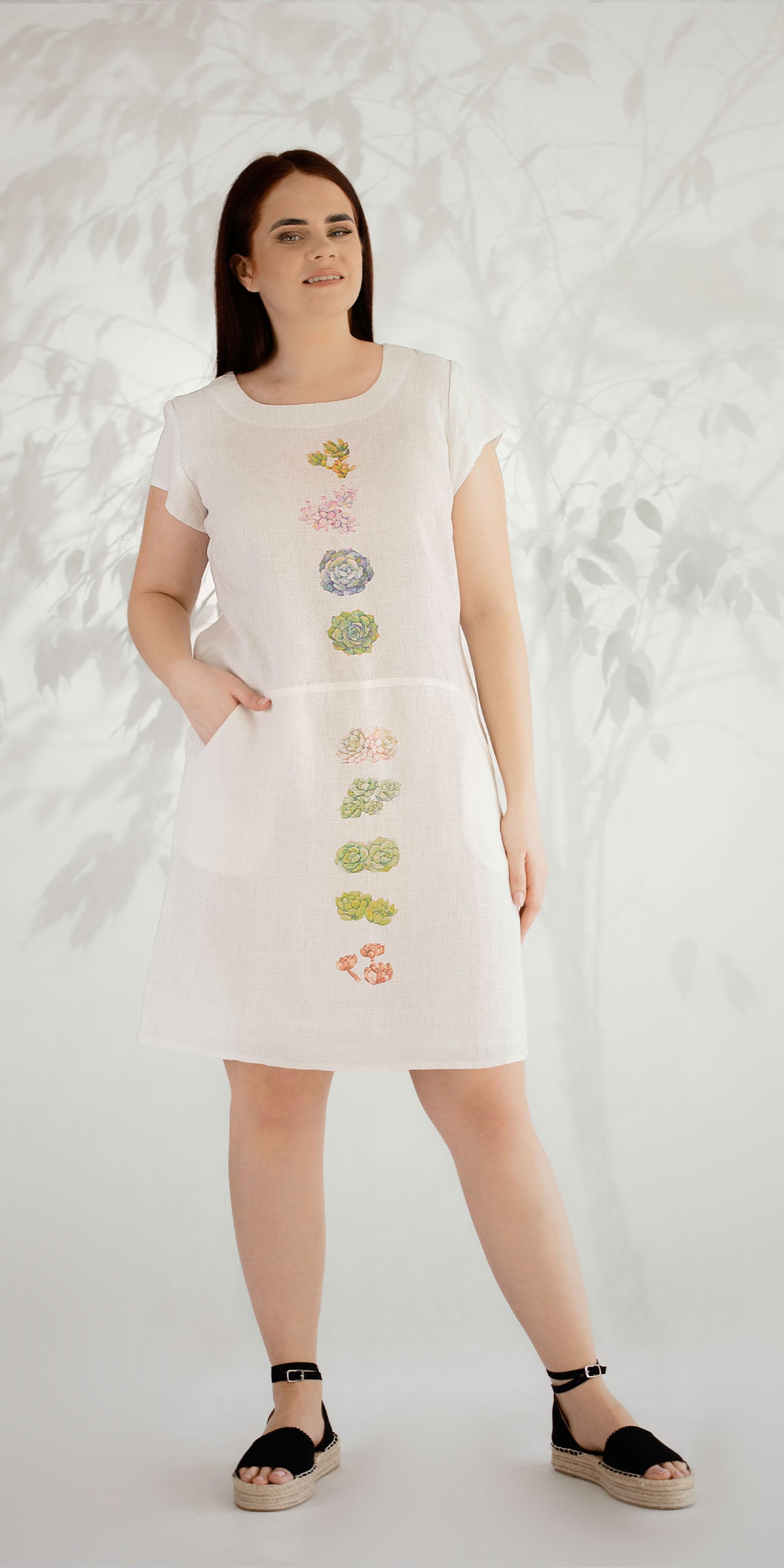 Trumpa tiesaus silueto lininė suknelė. Dvi šoninės kišenės. Apvalus kaklas. Apatinė suknelės dalis nuo liemens yra su pamušalu. Išskirtinumo suknelei suteikia atspari skalbimui tekstilės spauda.