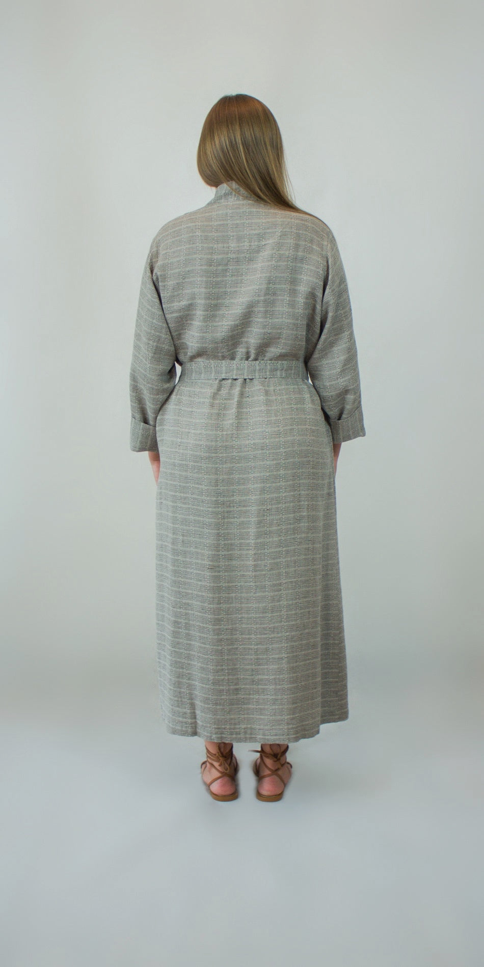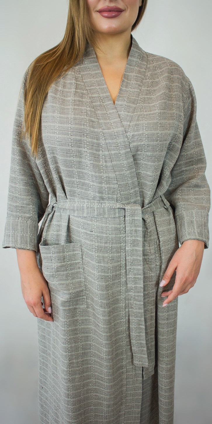 Natūralaus lino spalvos, austo audinio chalatas. Ilgos rankovės, uždėtinės kišenės, susiaučiamas to paties audinio diržu. Chalato audinys itin malonus liesti, todėl puikiai tinka dėvėti kasdien ar naudoti kaip pirties chalatą.