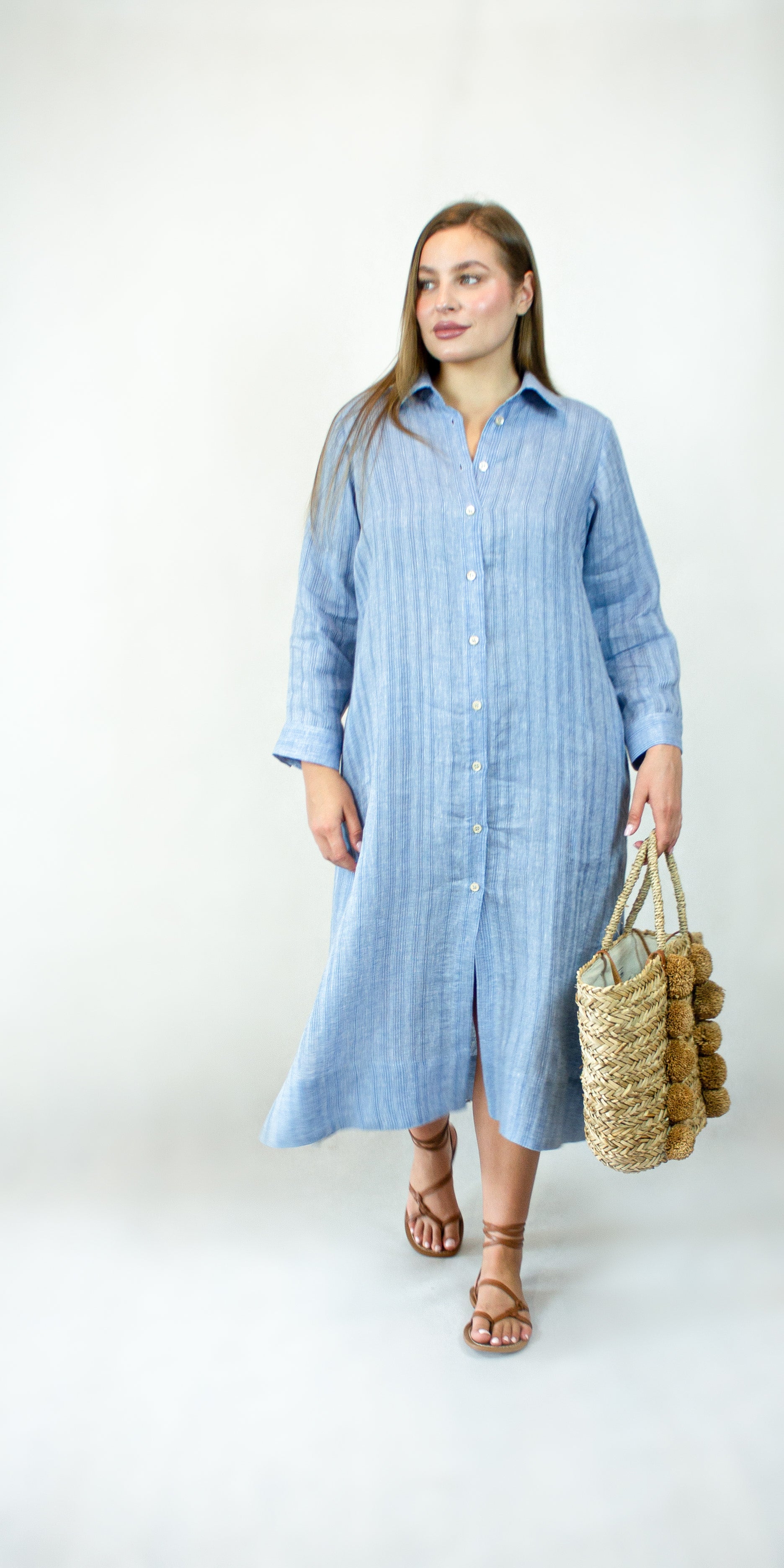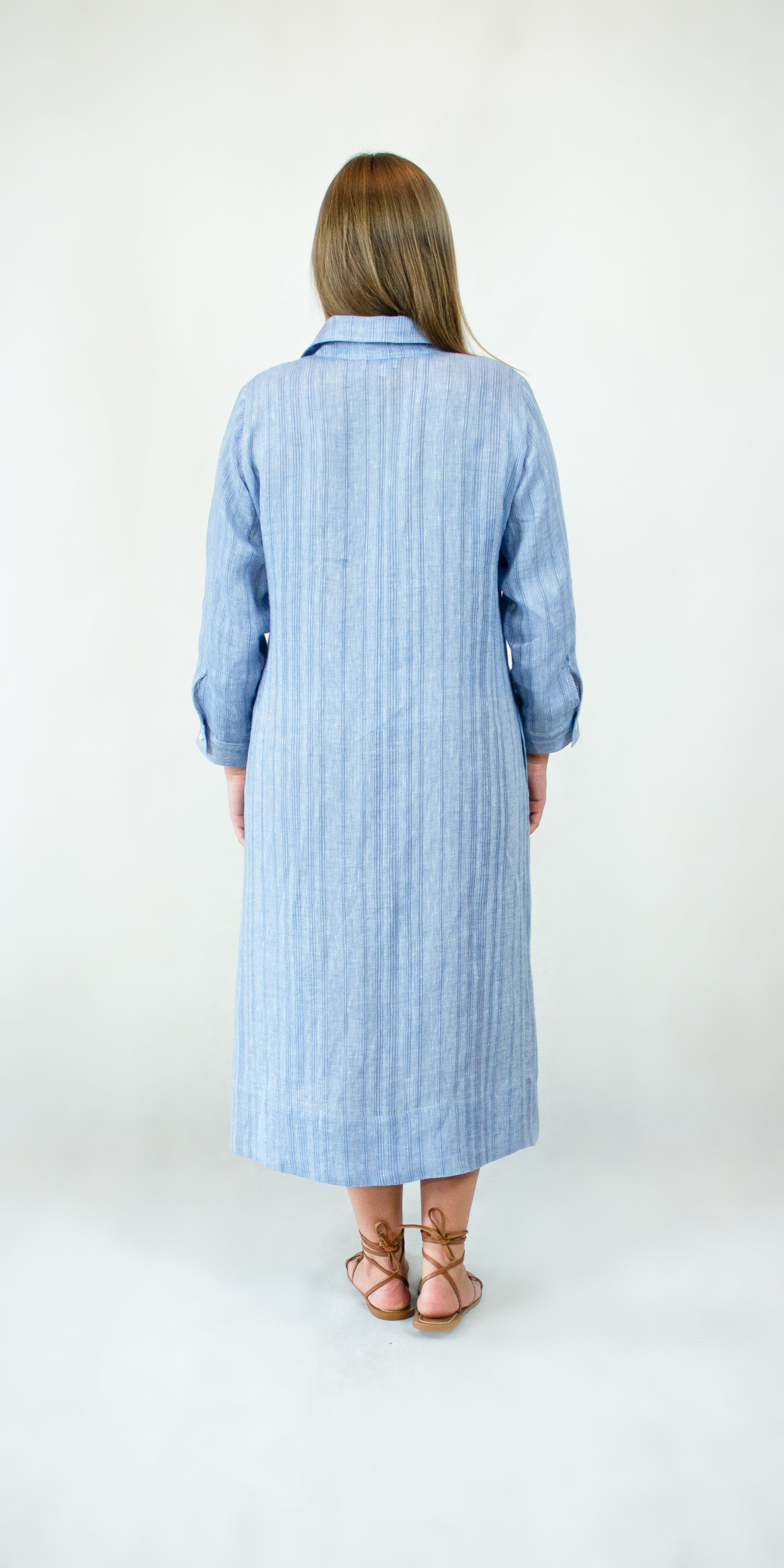 Plono lininio audinio marškinių tipo suknelė, priekyje užsegama sagomis, įleistinės kišenės, skeltukai šonuose.