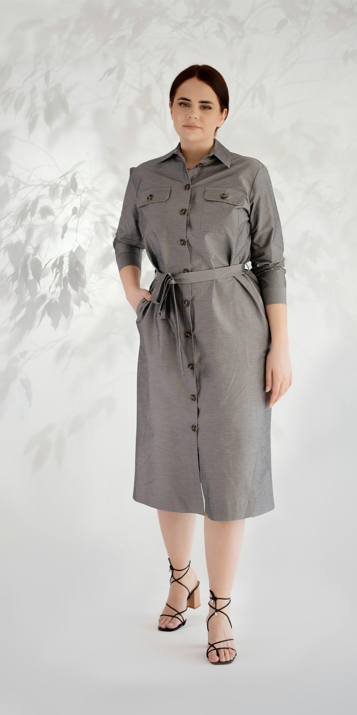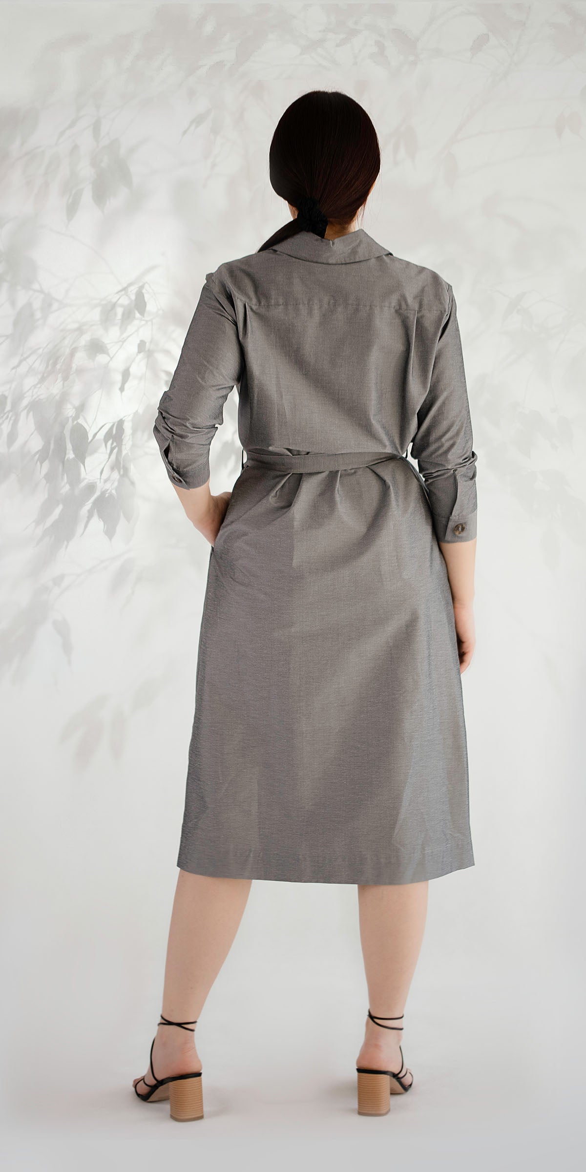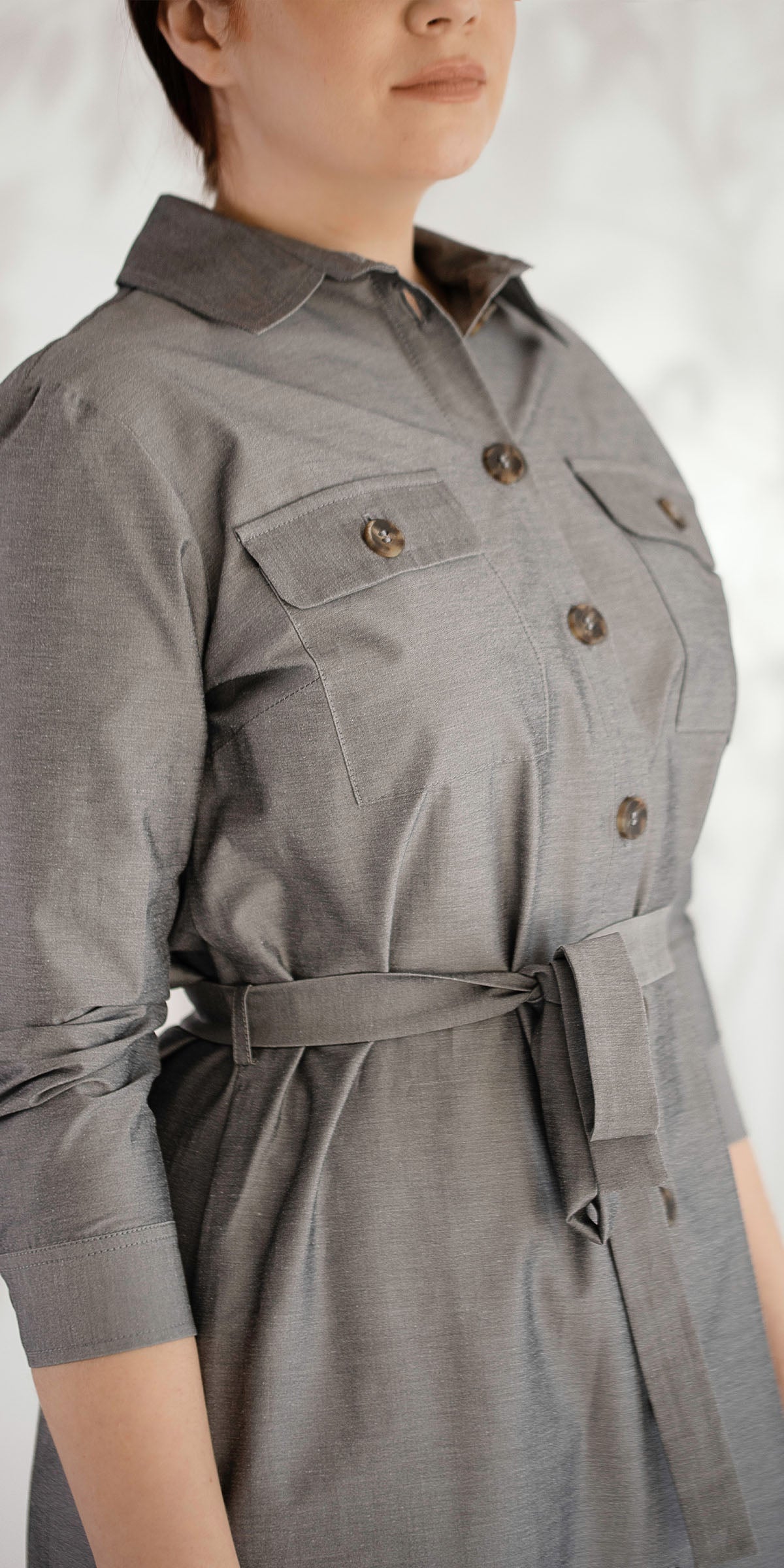 Lengvai blizgaus audinio marškinių tipo suknelė, priekyje susegama sagomis bei surišama varstomu dirželiu. Dvi kišenės ties krūtine ir dvi šoninės kišenės ties siūlėmis. Užsegami rankogaliai, rankovių ilgis 4/5.