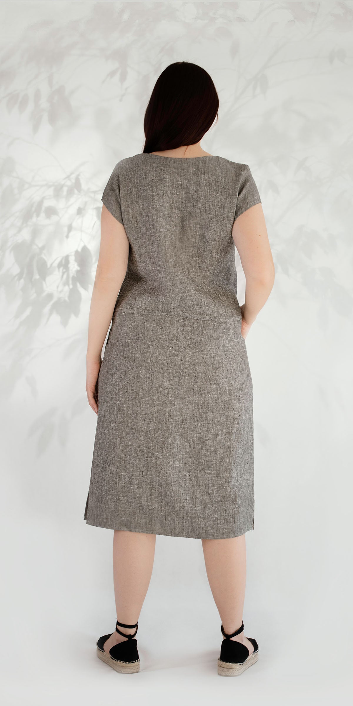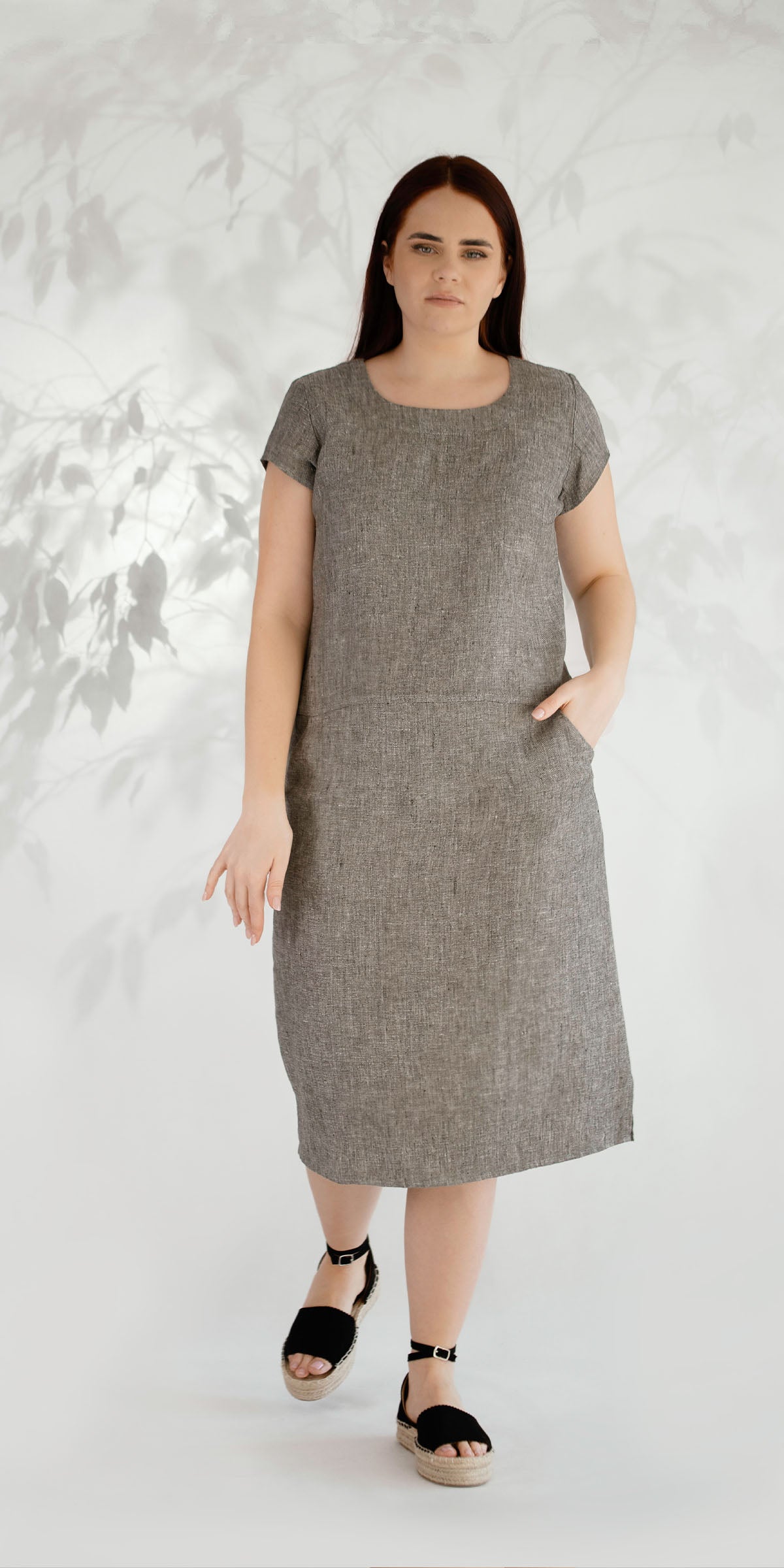 Tiesaus laisvo silueto suknelė, pagaminta iš minkšto, melanžinio lino. Dvi šoninės kišenės. Apvalus kaklas. Nedideli skeltukai suknelės šonuose.