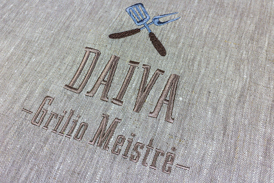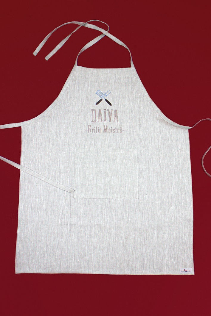 Lininė prijuostė su reguliuojamais raišteliais ties kaklu ir juosmeniu. Didelė kišenė priekyje. Galimi 6 spalvų variantai, bei jūsų pasirinktas užrašas.