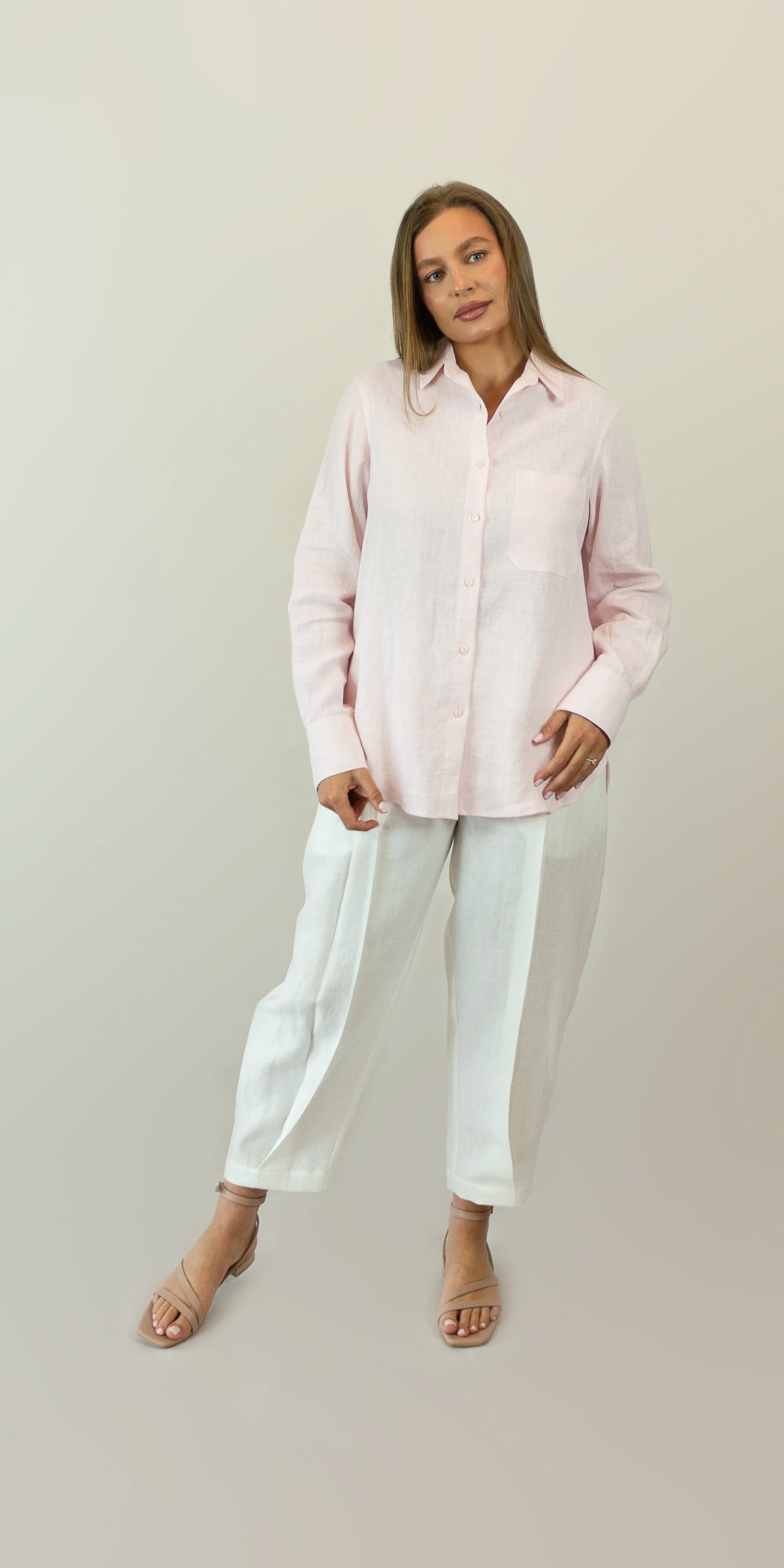 Klasikinio stiliaus lininiai marškiniai ilgomis rankovėmis. Šiek tiek prailgint nugara. Platūs rankogaliai. Viena uždėtinė kišenė. Sagutes ties rankogaliais ir priekyje. Norėdami oversize modelio, rinkitės vienu dydžiu didesnį dydį nei įprastai.
