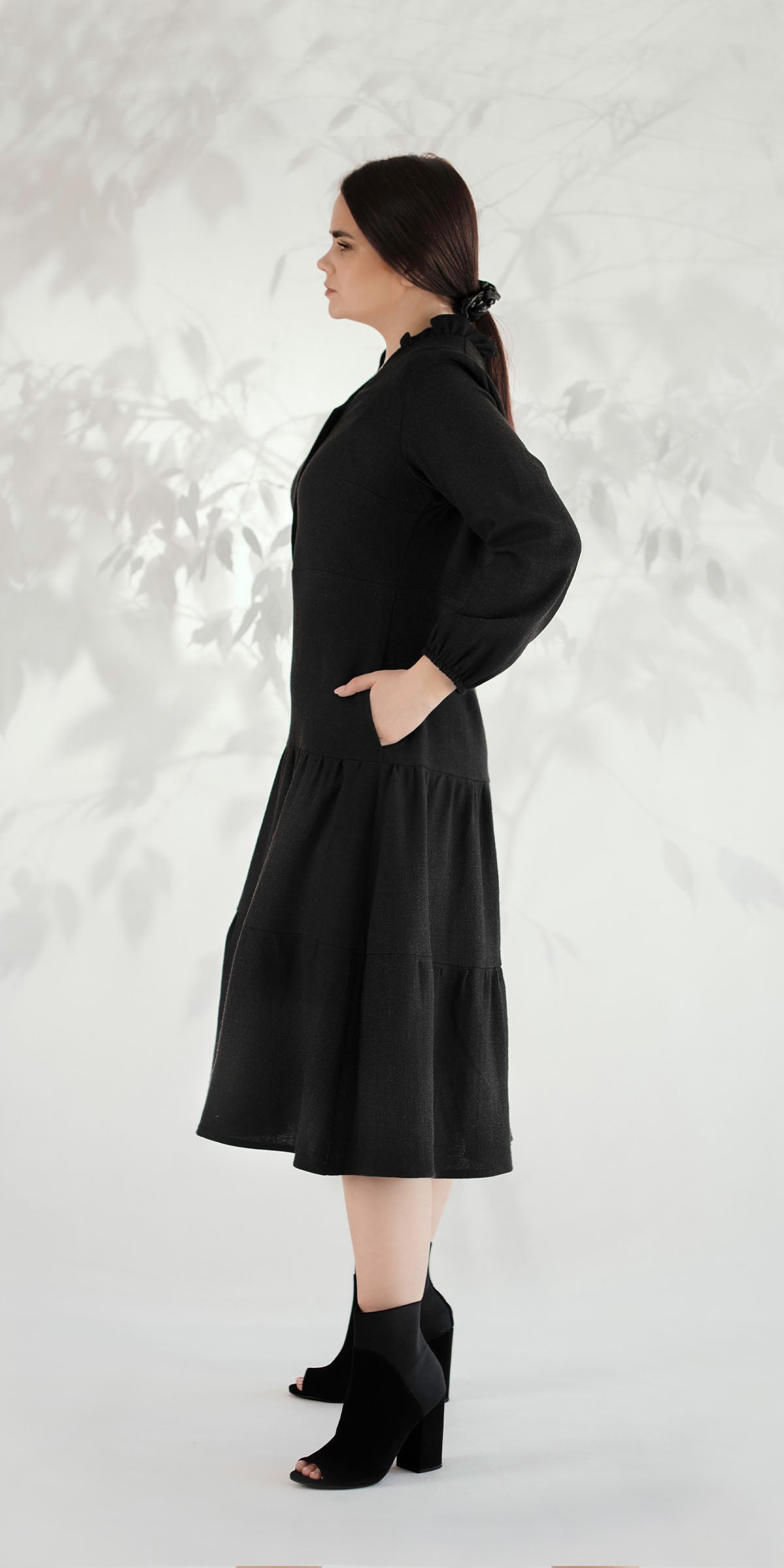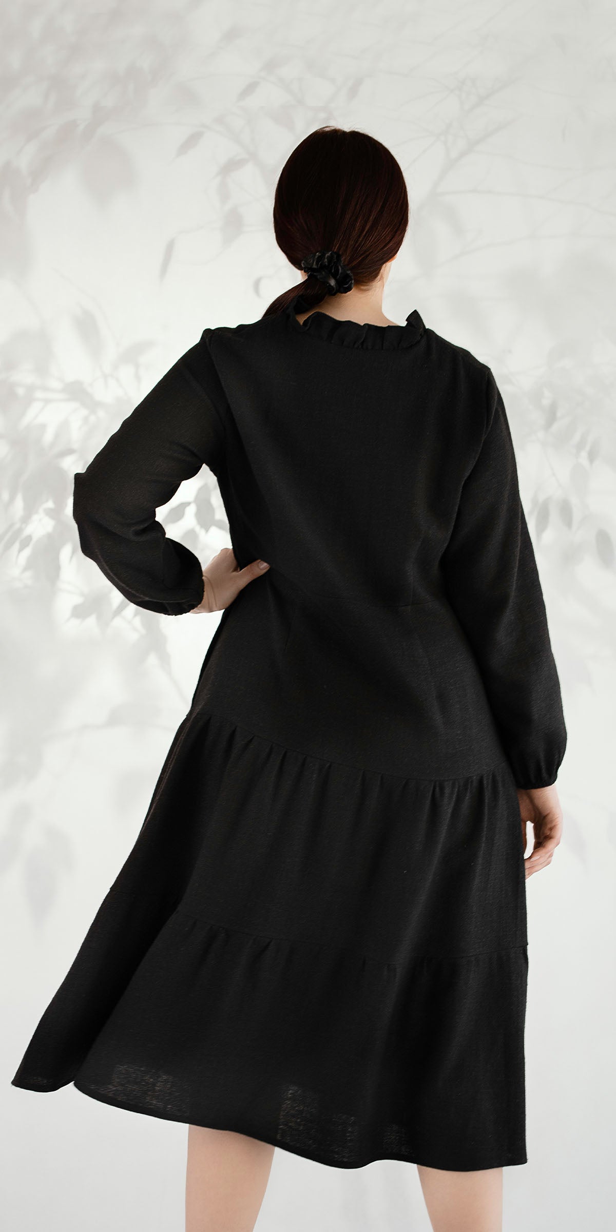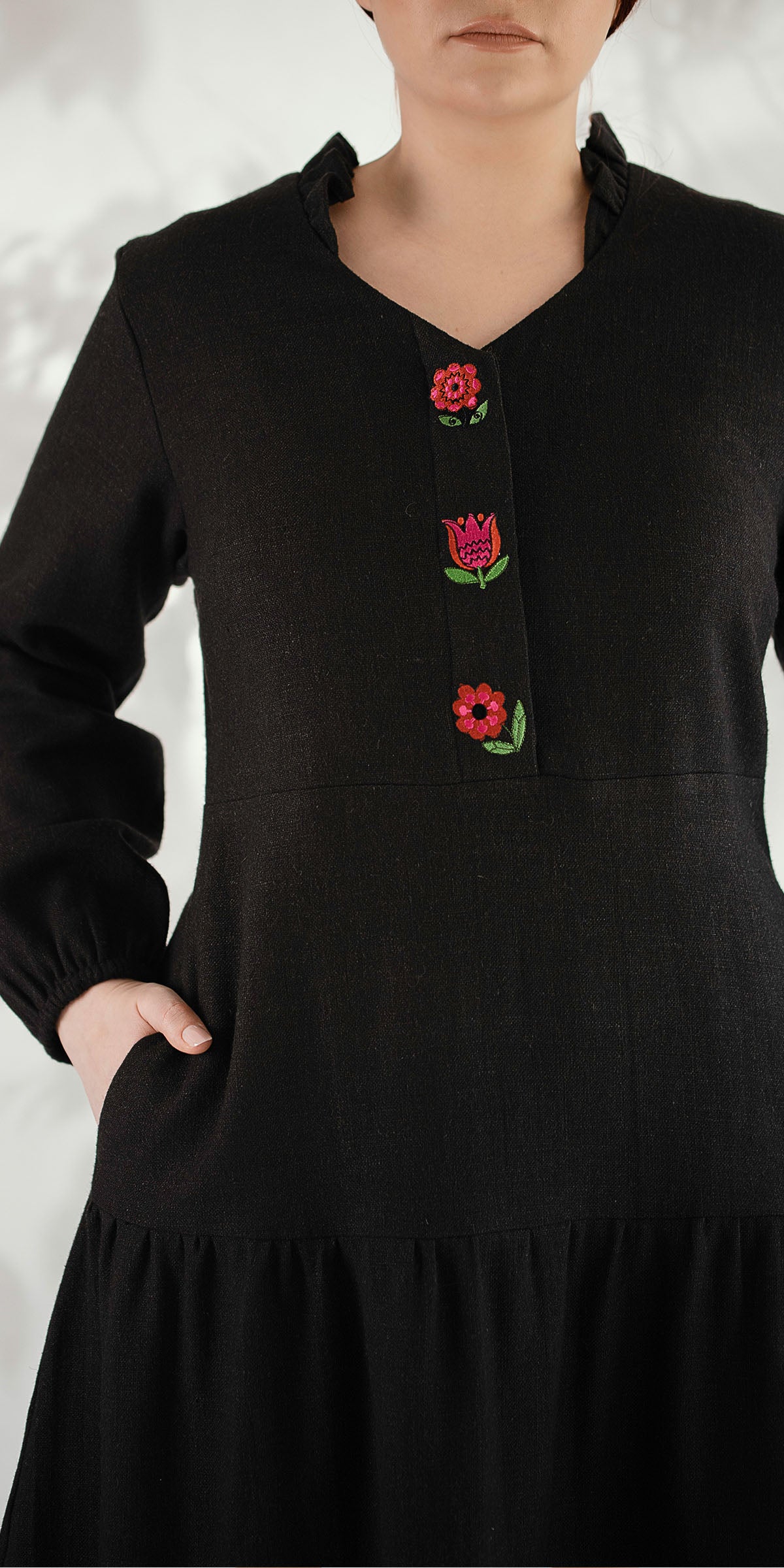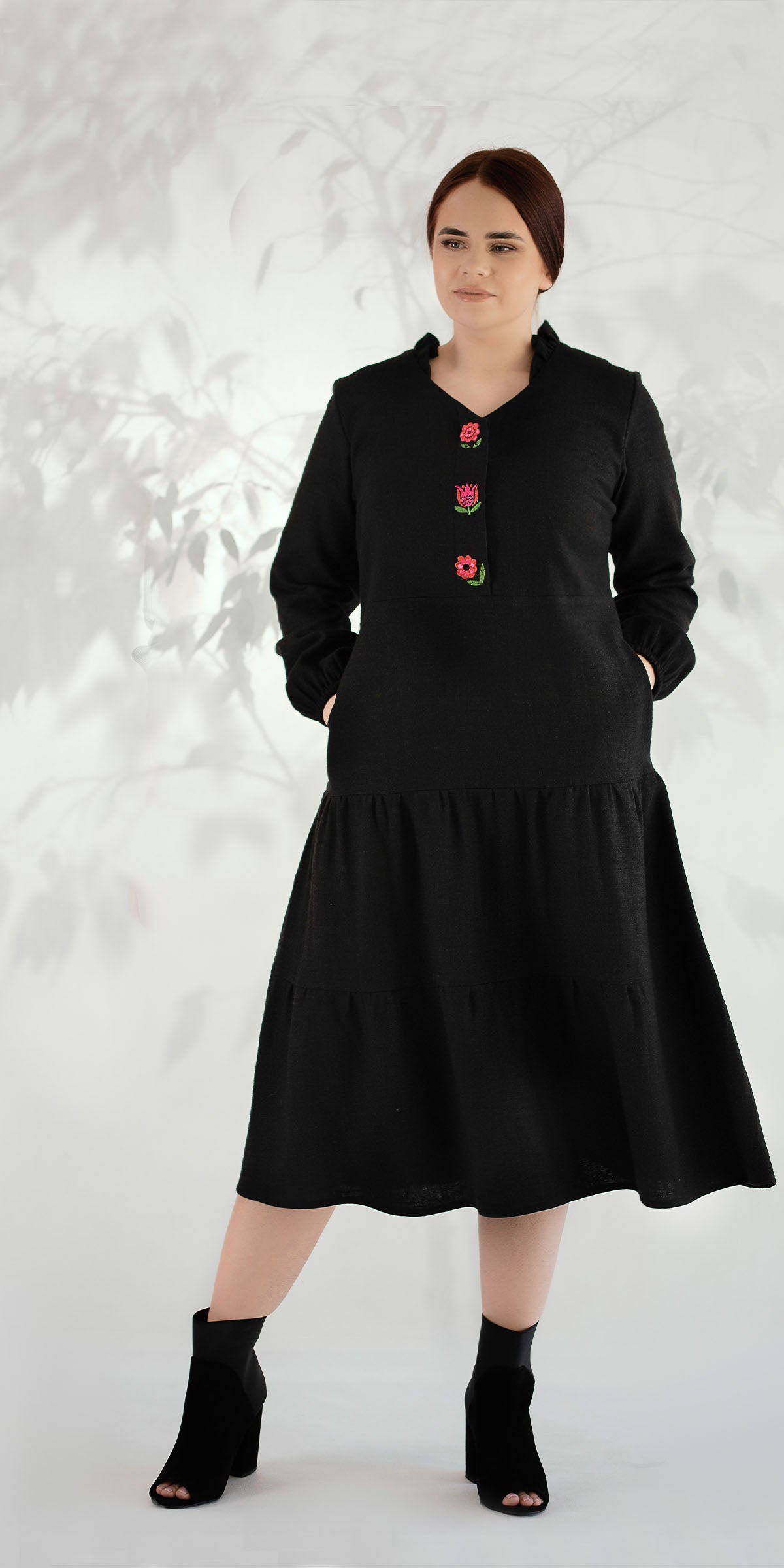 Laisvai krentanti trapecijos formos suknelė, priekyje paslėptas užsegimas bei išsiuvinėtos gėlės. Dvi šoninės kišenės ties siūlėmis. V formos kaklas su raukinukų apdaila. Ilgos pūstos rankovės su guma ties riešu.