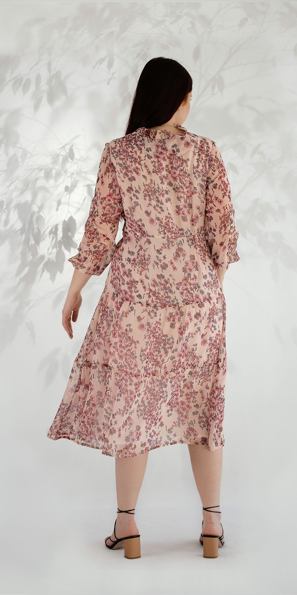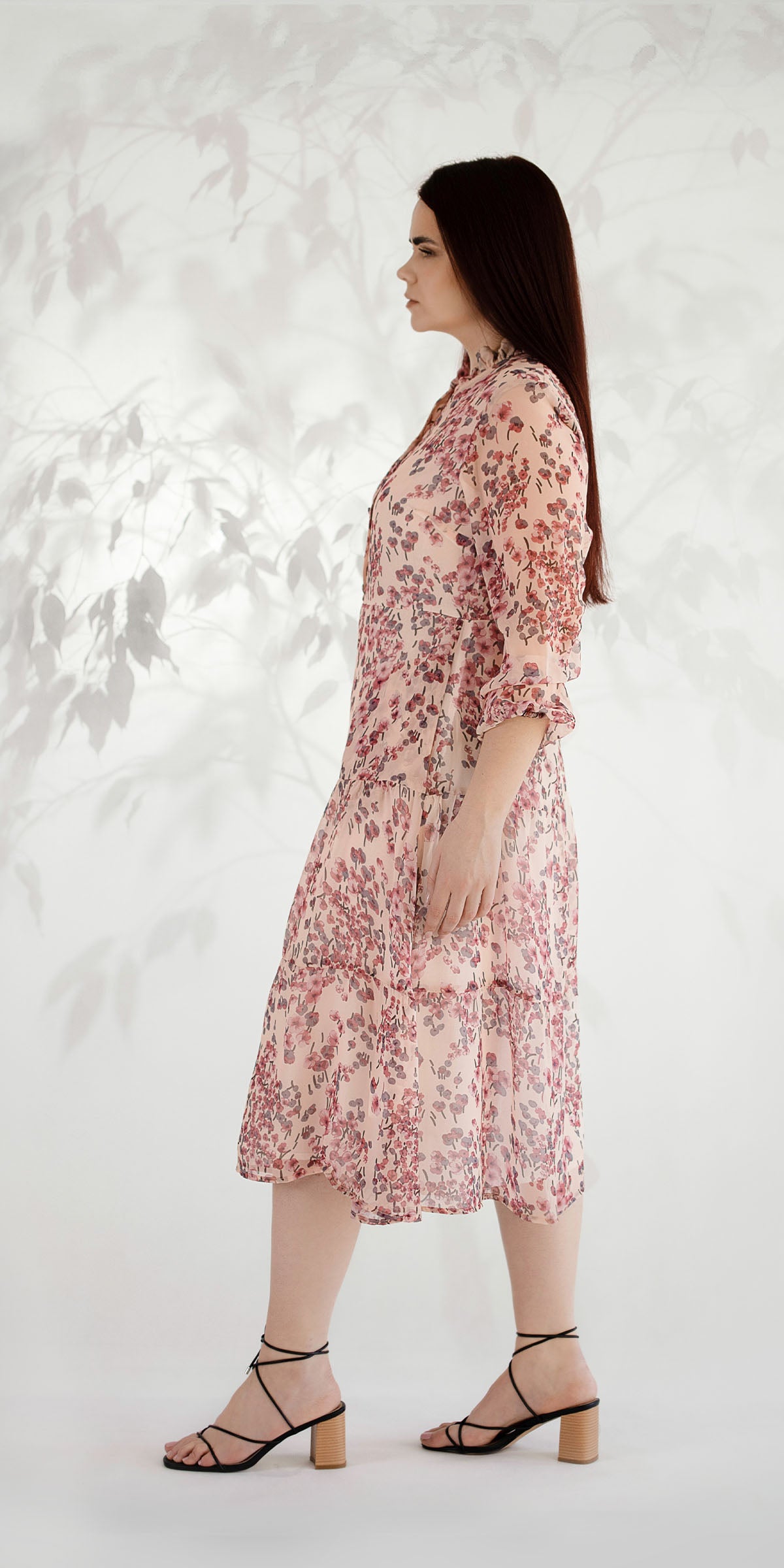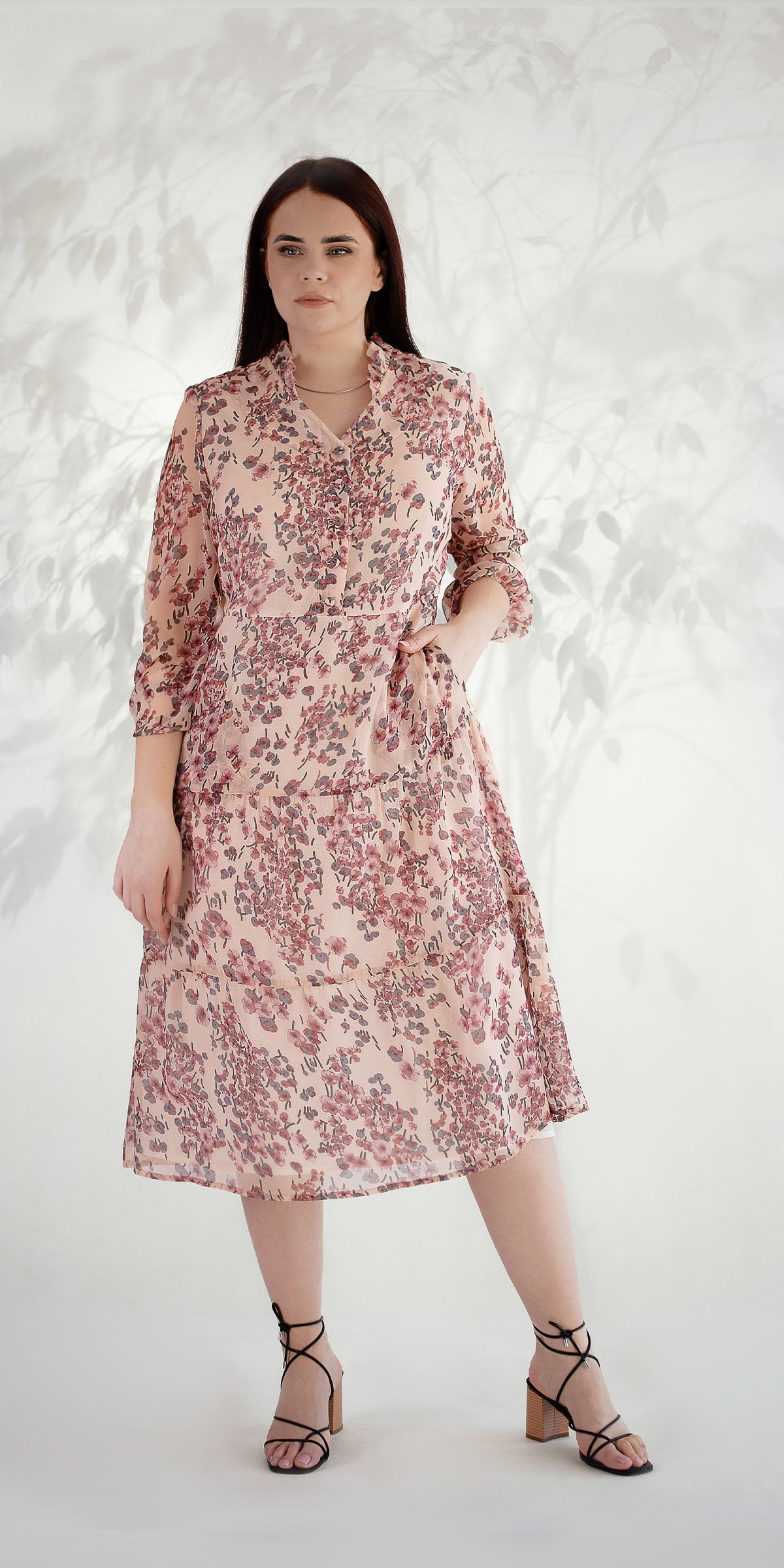 Plono peršviečiamo audinio suknelė su pamušalu, priekyje susegama to paties audinio aptrauktomis sagomis. Dvi šoninės kišenės ties siūlėmis. V formos kaklas su raukinukų apdaila. Ilgos pūstos rankovės su guma ties riešu.
