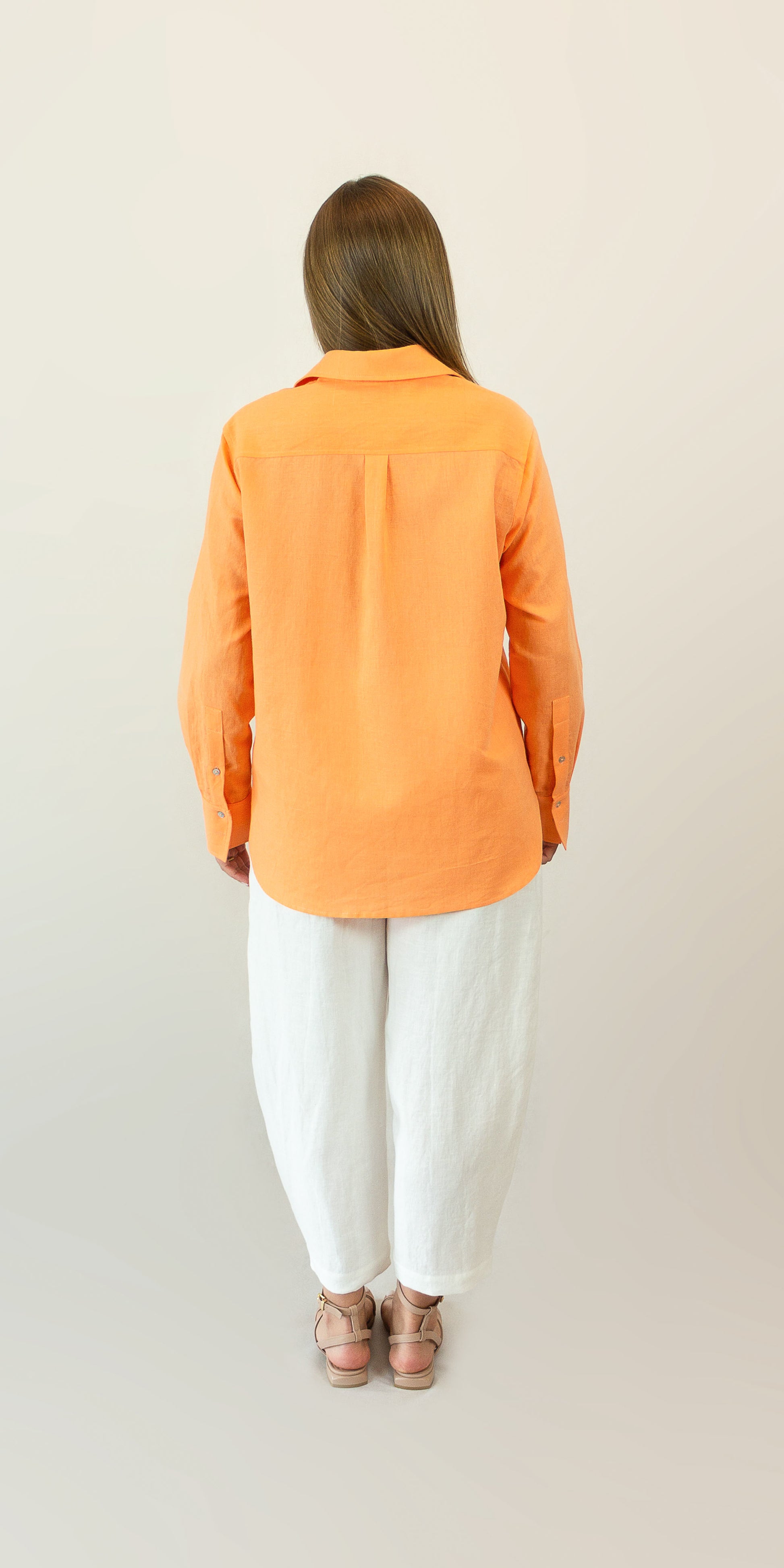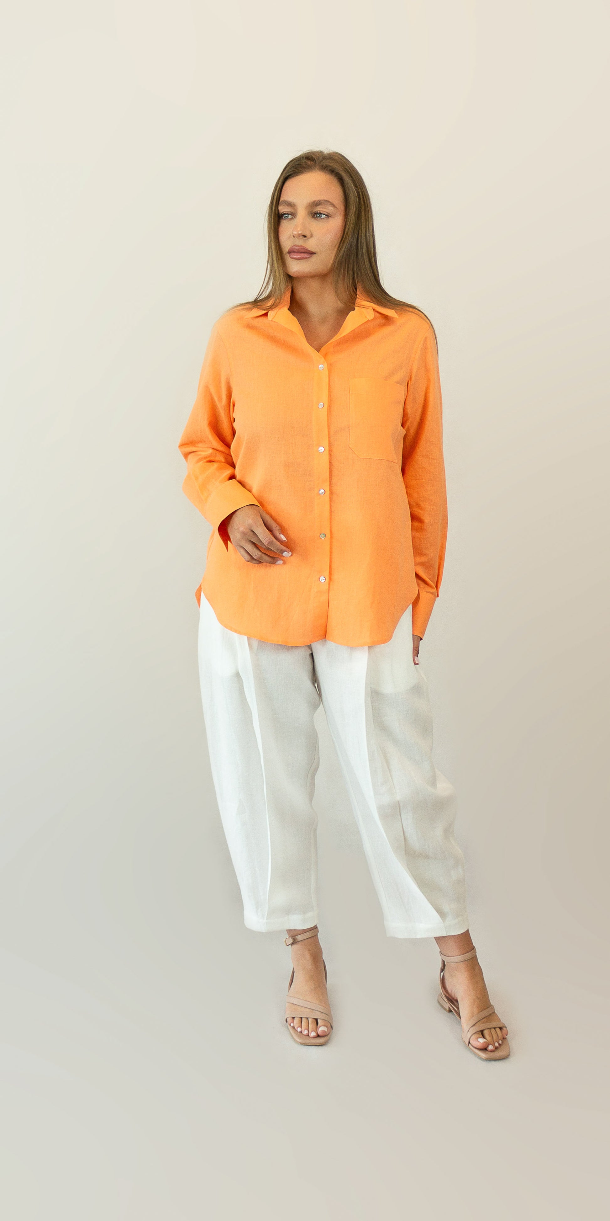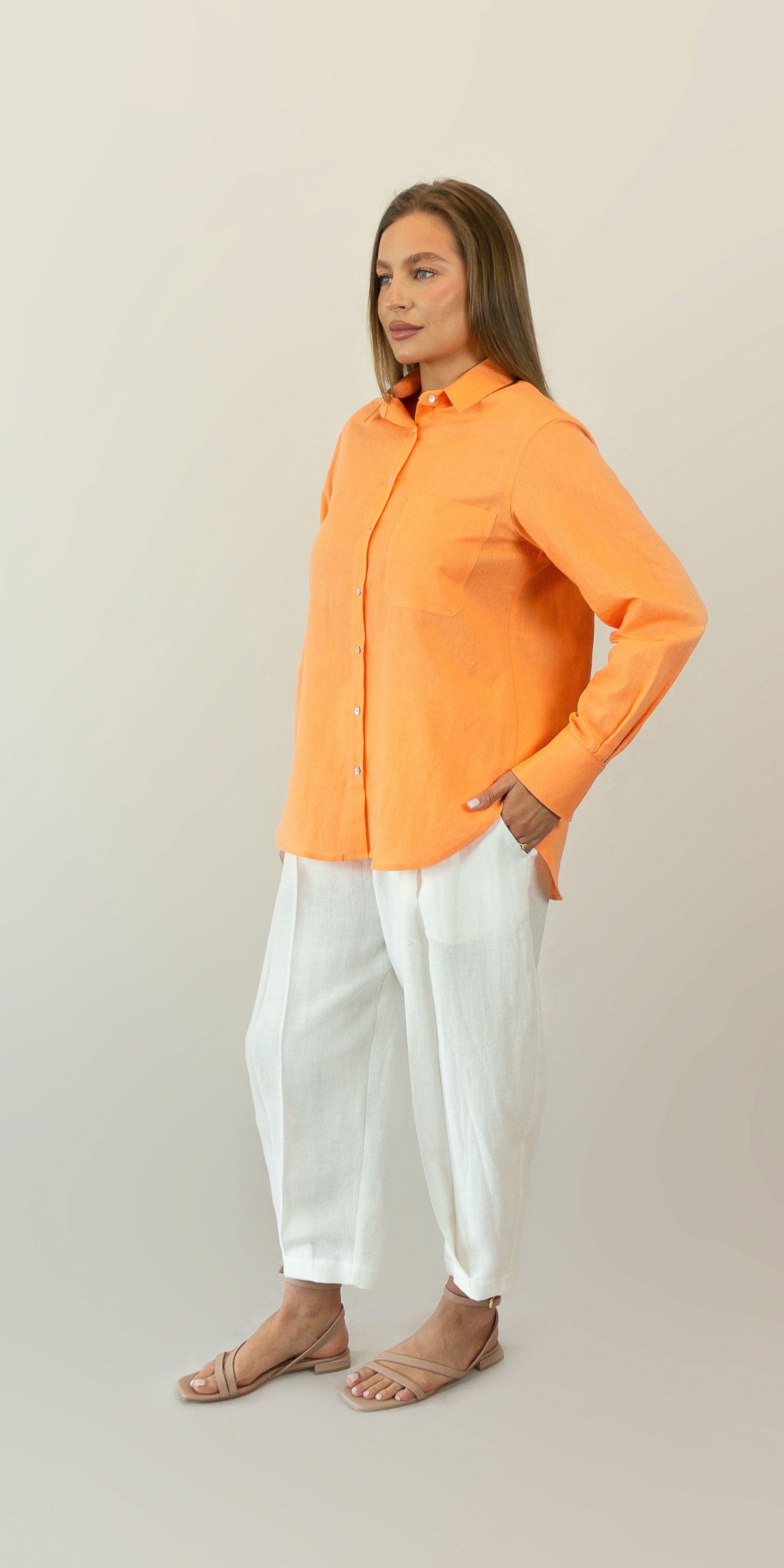 Klasikinio stiliaus lininiai marškiniai ilgomis rankovėmis. Šiek tiek prailgint nugara. Platūs rankogaliai. Viena uždėtinė kišenė. Sagutes ties rankogaliais ir priekyje. Norėdami oversize modelio, rinkitės vienu dydžiu didesnį dydį nei įprastai.
