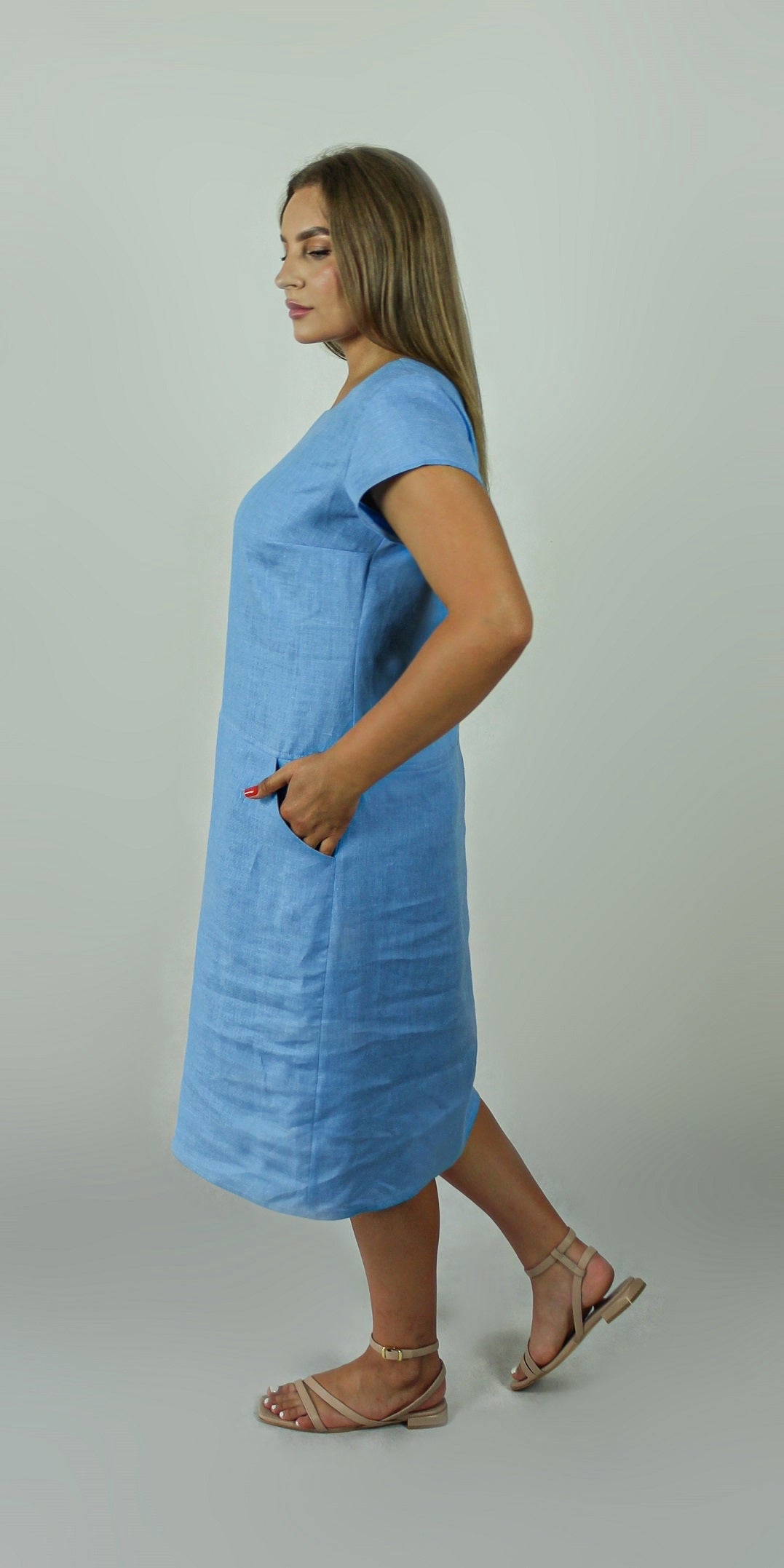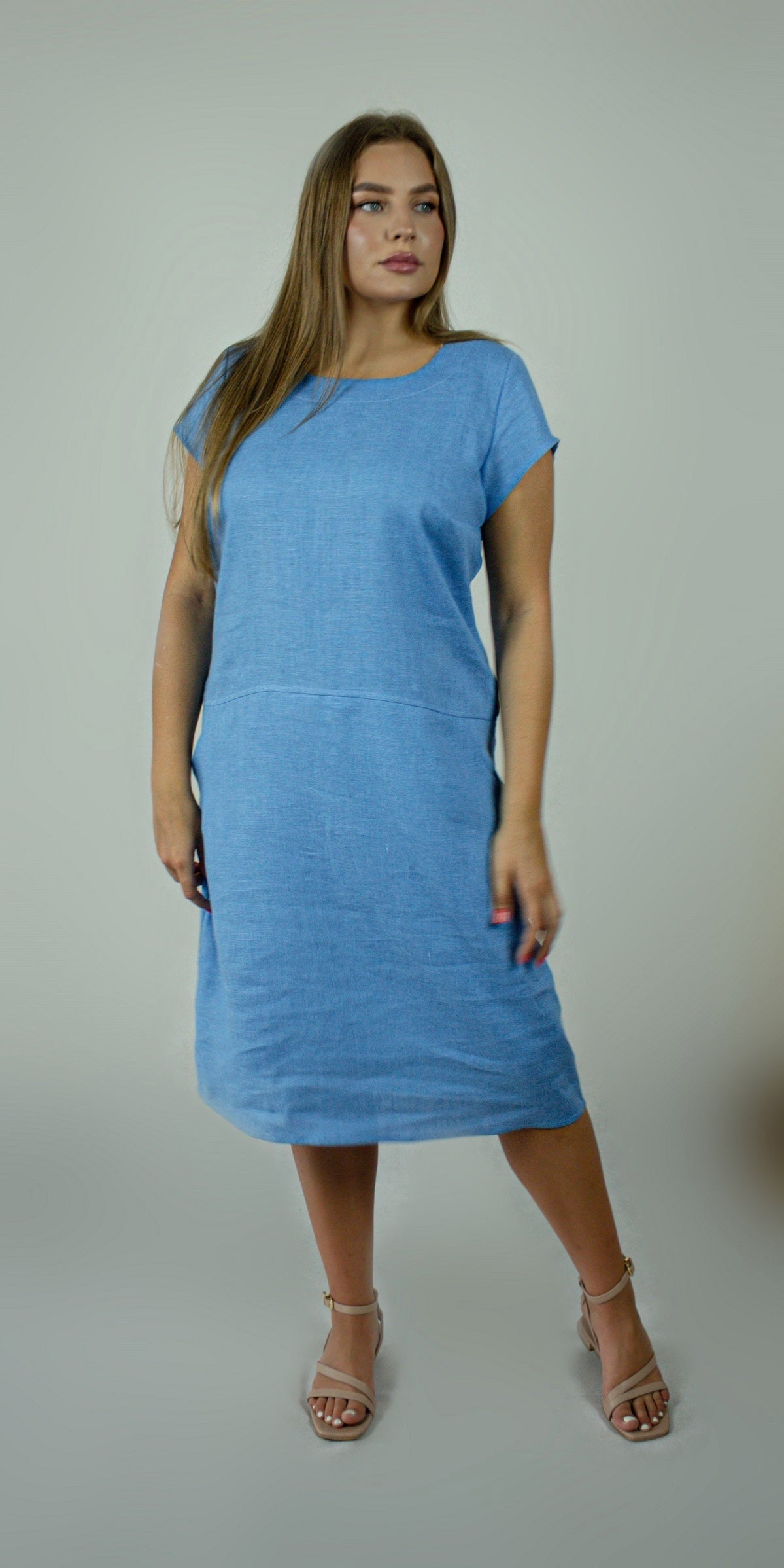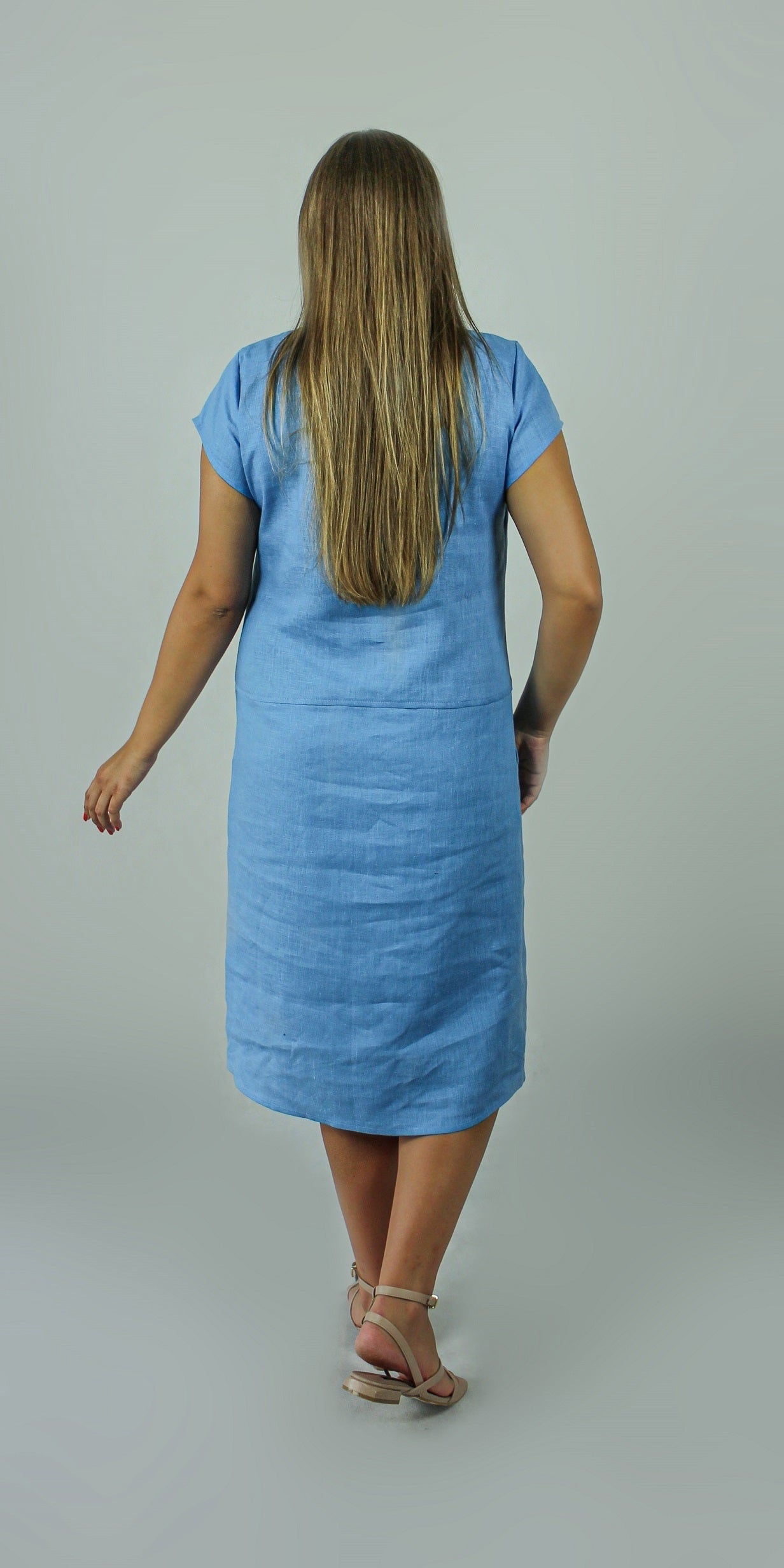 Tiesaus silueto lininė suknelė. Dvi šoninės kišenės. Apvalus kaklas.